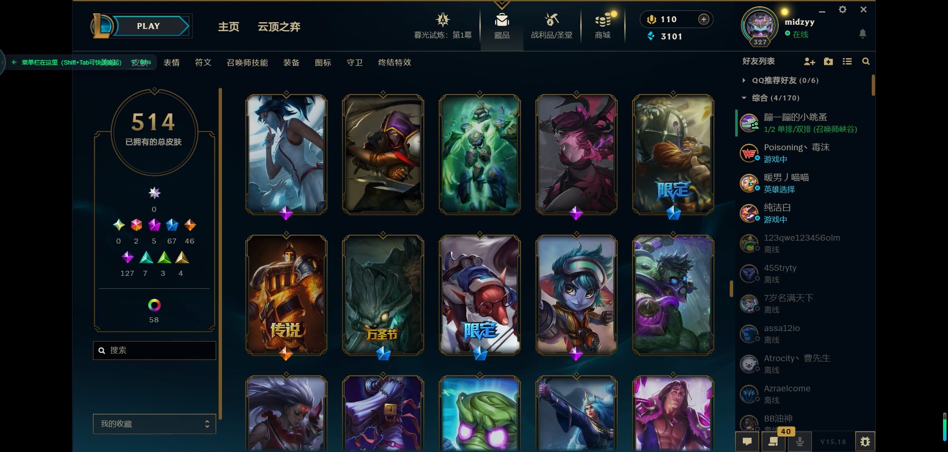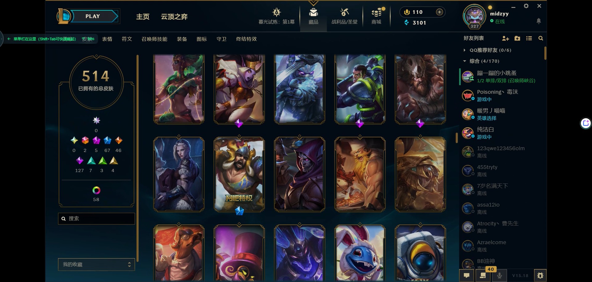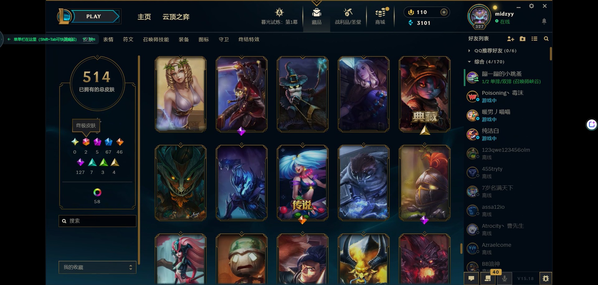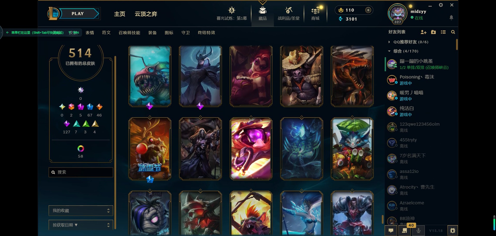 [12198411]2终极 5神话 67限定 46传说 127史诗 514皮肤 66炫彩 169英雄 可二次 可修改实名 优质装备:至臻 腥红之月 亚托克斯,银白审判 凯尔,源代码 乐芙兰,防爆天使 凯尔,暗影 沃里克,巧克力工坊 波比,都铎王朝 图奇,夺命美人 卡特,防爆士兵 炼金,钢铁之翼 凤凰,冠军之血 希瓦娜,红桃杰克 崔斯特,鸡里奥,惊悚派对 阿木木,警用试作体K-9 内瑟斯,克格汪 克格莫,密林猎手 提莫,送披萨的小姐姐 希维尔,野兽猎人 泰达米尔,勇者 奈德丽,御魔星矢 寒冰,灵魂守卫,DJ-娑娜,外星装甲 库奇,至臻 腥红之月 亚托克斯(2022),十五周年纪念 希维尔,魅影之刃 锐雯 限定:钢铁军团 拉克丝 情人节限定:甜心宝贝 安妮 赛季限定皮:胜利剑圣 易,胜利女神 奥利安娜,胜利机器人 布里茨 冠军限定系列:S13 T1 李青,S1FNC 酒桶,S1FNC 迦娜,S1FNC 嘉文四世,S2 暗杀星 蒙多,S2 暗杀星 努努,S2 暗杀星 慎,S3 SKT T1 劫,S3 SKT T1 薇恩,S3 SKT T1 李青,S3 SKT T1 婕拉,S4 SSW 雷恩加尔,S4 SSW 图奇,S5 SKT T1 滑板鞋,S5 SKT T1 蜘蛛 冰雪节限定:“主人不要我了” 阿木木,冰雪风暴 希维尔,冰雪节 马尔扎哈,冰雪节 炼金,冬季仙境 卡尔玛,胡桃夹子 小丑,平安夜女神 娑娜,魄罗骑士 瑟庄妮,圣诞开心鬼 提莫,圣诞精灵 崔丝塔娜,圣诞狂欢 时光,圣诞狂欢 努努,圣诞老人 酒桶,圣诞糖果棒 厄运小姐,圣诞玩偶 波比,圣诞驯鹿 克格莫,邪恶圣诞老人 维迦,幸福女神 乐芙兰,雪默丁格 万圣节限定:鬼影森森 茂凯,鬼影重重 魔腾,古拉伯爵 克烈,魅惑女巫 奈德丽,南瓜头 费德提克,无头骑士 人马 年限:蛇年 库奇,鸡年 阿兹尔 周年:4周年 锐雯,10周年 凤凰