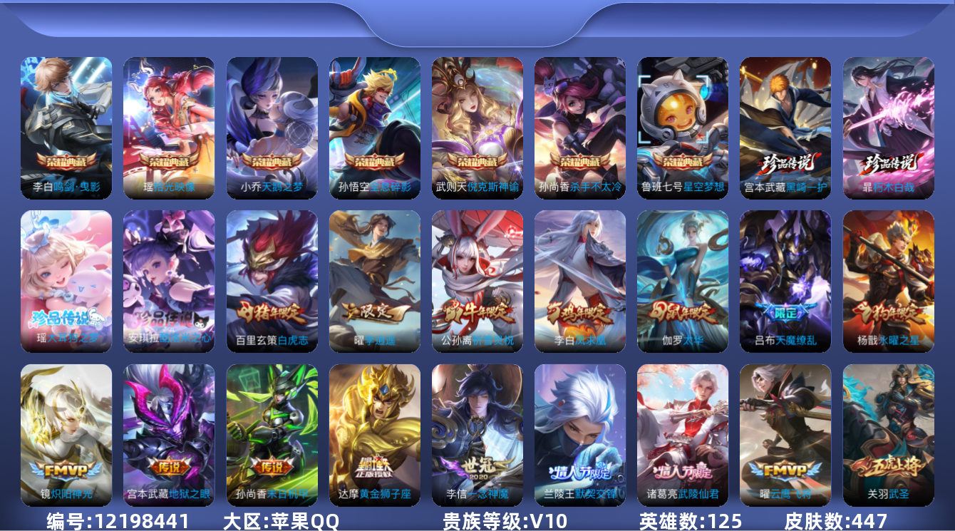 [12198441]V10 7典藏 4珍品传说 31传说 125英雄 447皮肤 典藏英雄武则天 可修改实名 优质装备:天鹅之梦(小乔典藏),星空梦想(太空人),倪克斯神谕(宇宙婆娘),杀手不太冷,鸣剑·曳影,全息碎影(猴子典藏),拾光映像(瑶典藏),酷洛米之心,大耳狗之梦,朽木白哉,黑崎一护,黄金狮子座,黄金射手座,云鹰飞将(小将军),黄金白羊座,猫影幻舞,久胜战神,炽阳神光,一念神魔,云霓雀翎,末日机甲-孙尚香(绿蚂蚱),地狱火,仲夏夜之梦(大飞蛾),海洋之心,地狱之眼,胖达荣荣,李逍遥,超时空战士-狄仁杰,妄想实况,艾琳觅芳踪,涂山容容 传说皮:幻光神枪 珍宝阁皮:优雅恋人,女武神,玩趣恶龙 限定皮:逐霄战戟,鸣野蒿,至尊宝,白虎志(电光耗子),凤求凰(白切鸡),凤凰于飞,太华(伽罗年限),梅西,武陵仙君(小桃花),时之彼端,白鹤梁神女,白晶晶,神威(电光马子),飞衡(韩信年限),玄嵩(庄周年限),瑞麟志(木兰年限),遇见飞天,高山流水,五谷丰年,青龙志(铠年限),冰锋战神,幽恒(沐浴露),武圣,天狼运算者,游园惊梦,梁祝,御风骁将(吕布年限),天狼狩猎者,逐梦之翼,逐梦之星,烈魂,岱宗(典韦年限),天狼溯光者,天狼征服者,奔雷神使(牛魔年限),祈雪灵祝(雪兔子),天狼绘梦者,李小龙,逐梦之影,永曜之星,辉光之辰,如梦令-嫦娥,如梦令-后羿,霸王别姬-项羽,霸王别姬-虞姬,默契交锋-兰陵王,默契交锋-花木兰,真爱至上,大圣娶亲,引擎之心,天魔缭乱,青春决赛季,冰霜恋舞曲,蜜橘之夏,热情桑巴,神奇女侠 史诗皮:鸭鸭历险记-刘禅,化蝶舞,灵蛊蚀心,星界战将,龙之律动,石田雨龙,茶境仙,破空之剑,战舞者,百相守梦-黄忠,遇见神鹿,紫霞仙子,苍穹之光,电玩小子(小书包),白龙吟,黄金分割率,特工魅影,千年之狐,永昼,江河有灵,魅语,百解令(蒙犽),蒙恬荣光圣徽,无限星赏官,青蛇,偶像歌手,晚萤,电玩·爆裂旋风,暗夜猫娘,龙骑士(小龙虾),末日机甲-吕布,猫狗日记-孙策,猫狗日记-大乔,乱世虎臣,节奏热浪,修罗,女仆咖啡,摇滚巨星,水果甜心,绅士熊喵,天才门将,星夜王子,心灵骇客,功夫厨神,德古拉伯爵,暗隐猎兽者,幽灵船长,鬼剑武藏,心灵战警,乐园奇幻夜,舞动绿茵,地狱岩魂,诗语江南,纤云弄巧,繁星吟游(呼啦呼啦),拒霜思,缤纷独角兽,乘风破浪,逐浪之夏,月团寄思,水晶猎龙者,曙光守护