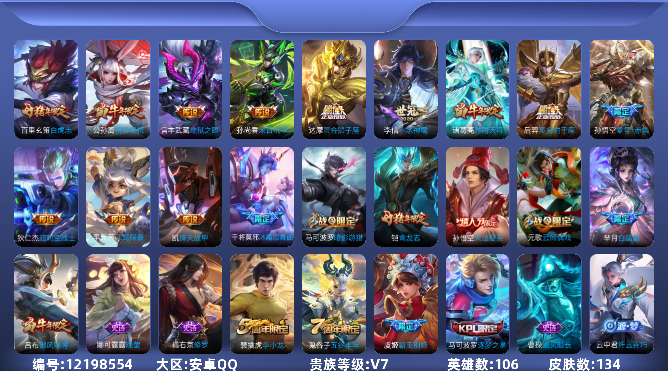 [12198554]V7 12传说 106英雄 134皮肤 可修改实名 优质装备:黄金狮子座,黄金射手座,绛天战甲(鸡嘴战神),一念神魔,末日机甲-孙尚香(绿蚂蚱),零号·赤焰,地狱之眼,飞鸢探春,超时空战士-狄仁杰 珍宝阁皮:女武神 限定皮:白虎志(电光耗子),白晶晶,时雨天司(水龙头),五谷丰年,青龙志(铠年限),天狼运算者,梁祝,御风骁将(吕布年限),逐梦之星,天狼溯光者,奔雷神使(牛魔年限),祈雪灵祝(雪兔子),李小龙,逐梦之光,霸王别姬-虞姬,大圣娶亲,冰霜恋舞曲 史诗皮:冰冠公主,晚萤,修罗,天才门将,德古拉伯爵,暗隐猎兽者,幽灵船长,纤云弄巧,繁星吟游(呼啦呼啦),逐浪之夏,鹰眼统帅