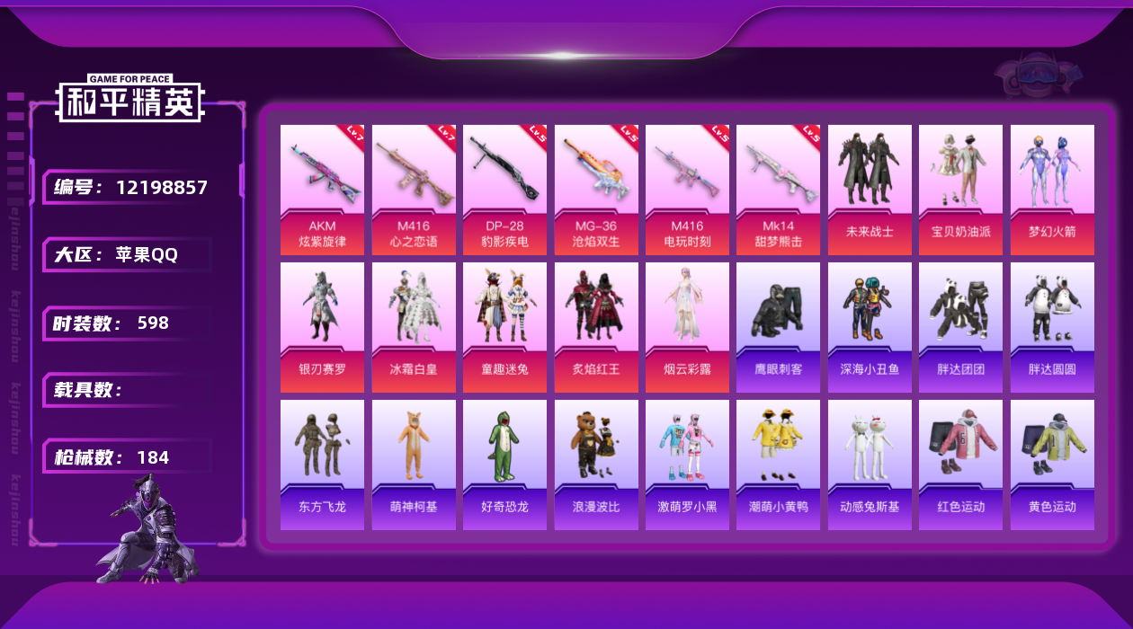 [12198857]8粉装 6特效枪 16印记 可二次 可修改实名 身法装备:暗影哥特(红眼罩),萌熊伴侣背包(粉熊背包) 优质装备:萌熊伴侣背包(粉熊背包),AKM炫紫旋律,M416心之恋语,梦幻火箭(新101)(新火箭少女101粉色套装),未来战士,宝贝奶油派,炙焰红王,冰霜白皇,银刃赛罗,童趣迷兔,七级M416-心之恋语,七级AKM-炫紫旋律,M416电玩时刻,MK14-甜梦熊击 热门装扮:烟云彩露,动感兔斯基,胖达圆圆,胖达团团,萌神柯基,激萌罗小黑,潮萌小黄鸭,鹰眼刺客,深海小丑鱼,东方飞龙,浪漫波比,好奇恐龙 稀有枪皮:MG-36-沧焰双生,DP-28-豹影疾电 五级特效枪:五级DP-28-豹影疾电,五级MG-36-沧焰双生,五级MK14-甜梦熊击,五级M416-电玩时刻 紫色装扮:极速光影,SS31特训套装,SS23特训,云朵鹅,彩虹兔,雪绒豹,SS33特训套装,顶瓜瓜,田园牧歌,轻风白浪,和煦暖阳,SS22特训,莱茵河畔,夏日倾情,北国孤狼,吉莉礼服,圣诞大吉,夏日音浪,幻世战舞者,幻影武者,怒火燎原,刚毅裁决者,SS3特训,时希公主,SS2特训,SS5特训,军械专家,冰川特警,SS21特训,时空追击者,暴风机械师,SS16特训,冰爽风暴,天籁歌者,瑞龙福将,团圆交子,醒狮腾龙,SS17特训,治愈之星,迅捷之星,科技之星,SS14特训,萌趣颜团子,特种颜团子,快乐星愿,青春冒险家,潮流游乐家,SS15特训,甜心亚梦,虚音幻奏,SS20特训,娇憨猪猪,萌趣咩咩,异彩先驱,缤纷焰火,SS18特训,雪兔飞飞,飞驰魅影,音速流光,SS19特训,飞行日记,魅力单车,鹤鸣,麻辣教官,黄色运动,龟仙人,蝶变,青涩年华,都市魅力,长空猛禽,雪山精英,霓虹极客,霓虹街区,熔岩游骑兵连帽夹克,跃动心情,战地菁英,滨海假日,滨海厨神,潮流炫酷,灰色格斗者,灿烂千阳,炫蓝之夏,牛气冲天,牛气满满,探宝勇士,柠萌假日,沙漠兵团,沙漠毒蛇,特战装甲,红色运动,绮丽涂鸦,缤纷果语,虎虎生威吉莉,登山爱好者,狂沙舞者,王牌教练,甜蜜告白,甜蜜熊情侣,疯狂小兔子,竞技勇士朋克,破蛋小黄鸡,福星高照,空投萌叽,玉兔迎春,竞技名士,暗影哥特(红眼罩),神气柴柴,懵萌河马,SS24特训(SS24特训套装),SS27特训,Alan Walker,浪漫天命,小丑鱼,SS7特训,SS8特训,顽皮玉兔,PEL摇滚竞