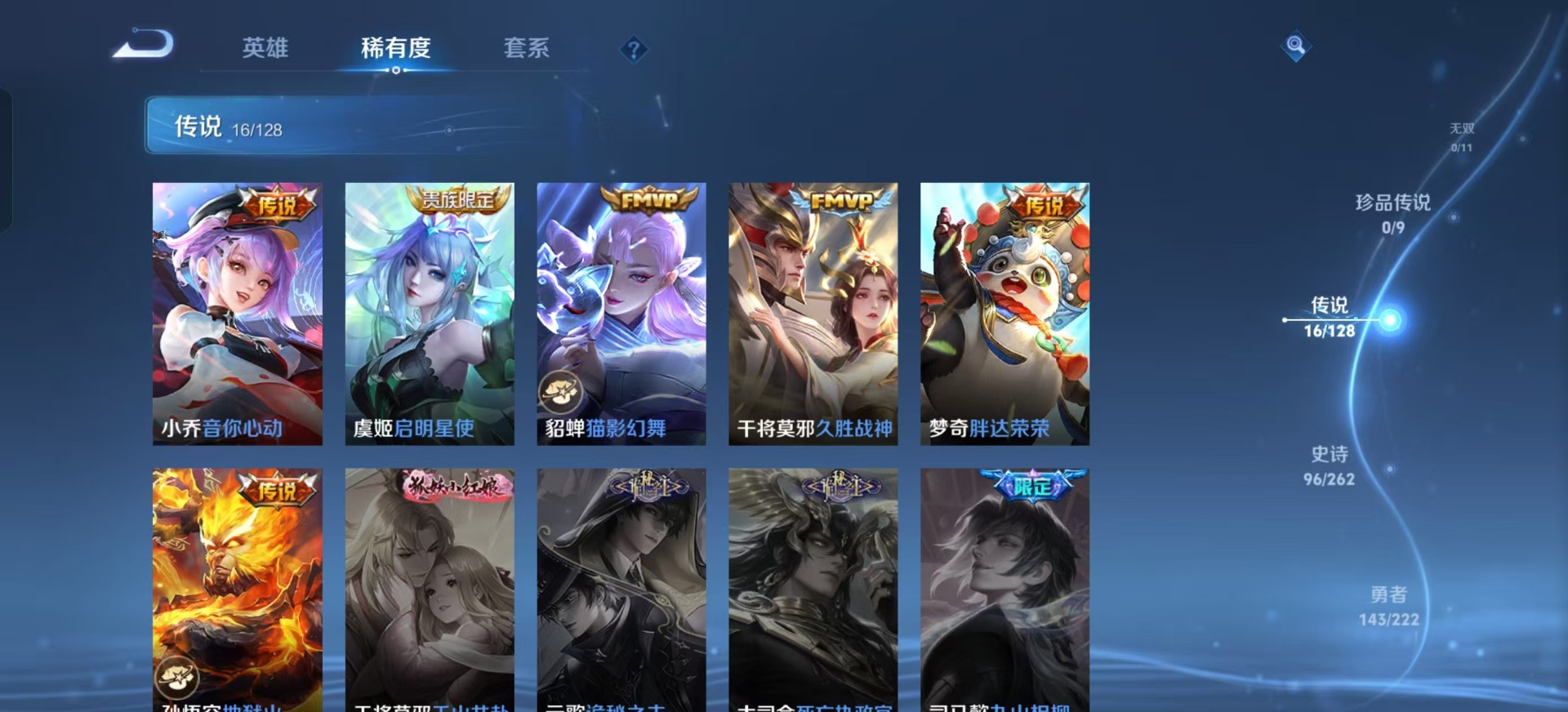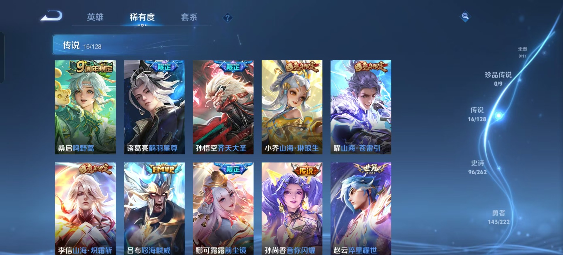 - [12265640]V5 1典藏 4传说 124英雄 120皮肤 可修改实名 优质装备:星域神启(倪克斯贼亮),久胜战神,涂山容容 传说皮:幻光神枪 珍宝阁皮:万物之道 限定皮:愿照·山河定(司空震年限),逐霄战戟,鸣野蒿 史诗皮:器灵·浮梦炉,化蝶舞,龙之律动,石田雨龙,茶境仙,百相守梦-黄忠,紫霞仙子,特工魅影,千年之狐,百解令(蒙犽),高渐离燃音魔法,蒙恬荣光圣徽,偶像歌手,女仆咖啡,摇滚巨星,水果甜心,功夫厨神,幽灵船长,鬼剑武藏,暗渊魔法,心灵战警,乐园奇幻夜,纤云弄巧,水晶猎龙者,鹰眼统帅,魅力维加斯,未来纪元-赵云