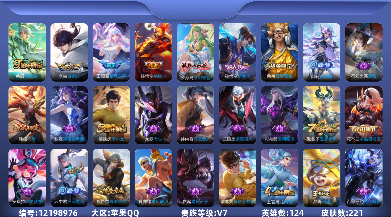 [12198976]V7 4传说 124英雄 221皮肤 可修改实名 优质装备:地狱火,涂山容容 珍宝阁皮:胡桃夹子,玩趣恶龙 限定皮:逐霄战戟,鸣野蒿,至尊宝,星穹之声,飞衡(韩信年限),遇见飞天,诗剑行,五谷丰年,梁祝,李小龙 史诗皮:化蝶舞,星界战将,黄金分割率,特工魅影,江河有灵,魅语,百解令(蒙犽),蒙恬荣光圣徽,冰冠公主,猫狗日记-孙策,时之恋人-孙尚香,乱世虎臣,节奏热浪,水果甜心,星夜王子,心灵骇客,功夫厨神,德古拉伯爵,鬼剑武藏,暗渊魔法,舞动绿茵,纤云弄巧,繁星吟游(呼啦呼啦),缤纷独角兽,乘风破浪,逐浪之夏,水晶猎龙者,金属风暴,原初追逐者,圣诞狂欢,圣诞恋歌,鹰眼统帅,魅力维加斯,黎明之约,无心,未来纪元-赵云