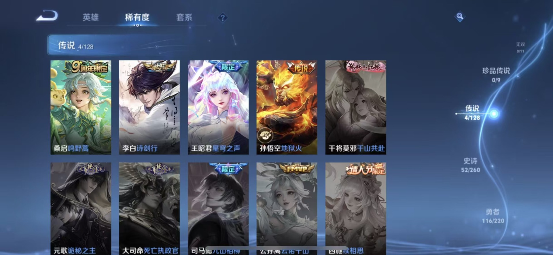 - PX_2056632-36 苹果QQ/永恒钻石/323皮肤/124英雄/1典藏/0珍品无双/0无双/0珍品传说/28传说/84史诗/9稀有英雄 【1 典藏皮肤】天鹅之梦 小乔, 【28 传说皮肤】胖达荣荣 梦奇,武圣 关羽,启明星使 虞姬,云霓雀翎 虞姬,飞鸢探春 李元芳,白虎志 百里玄策,李逍遥 曜,零号·赤焰 孙悟空,云鹰飞将 曜,凤求凰 李白,猫影幻舞 貂蝉,仲夏夜之梦 貂蝉,记忆之芯 公