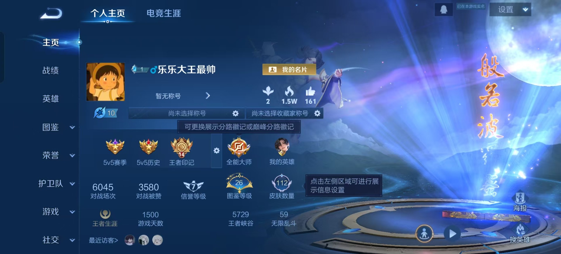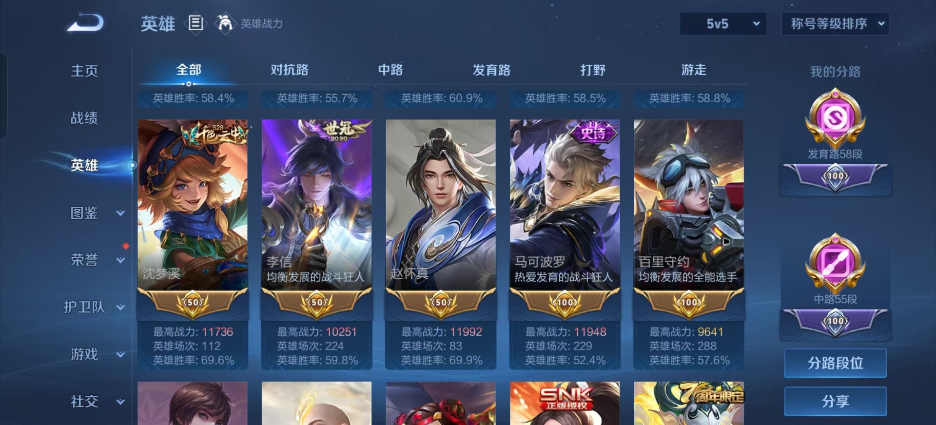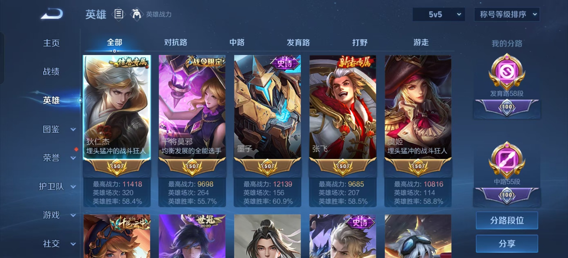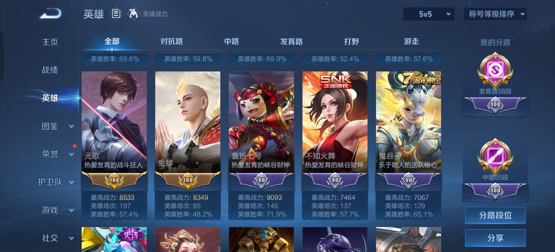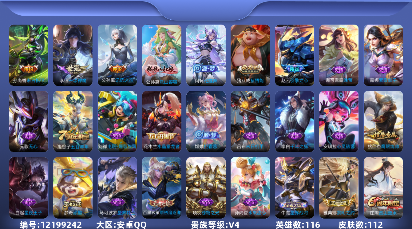 - PX_2106883-实名: 可修改 贵族等级: V5 英雄数: 97 皮肤数: 70 传说皮: 超时空战士-狄仁杰 限定皮: 李小龙,梁祝,至尊宝,霸王别姬-虞姬