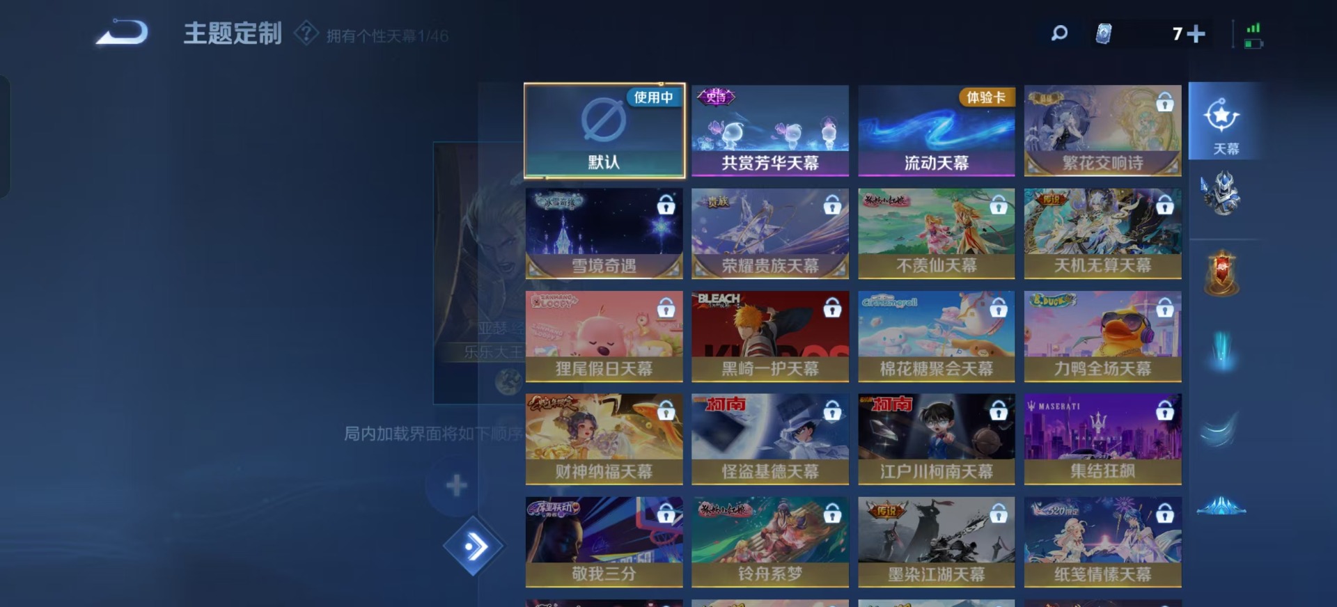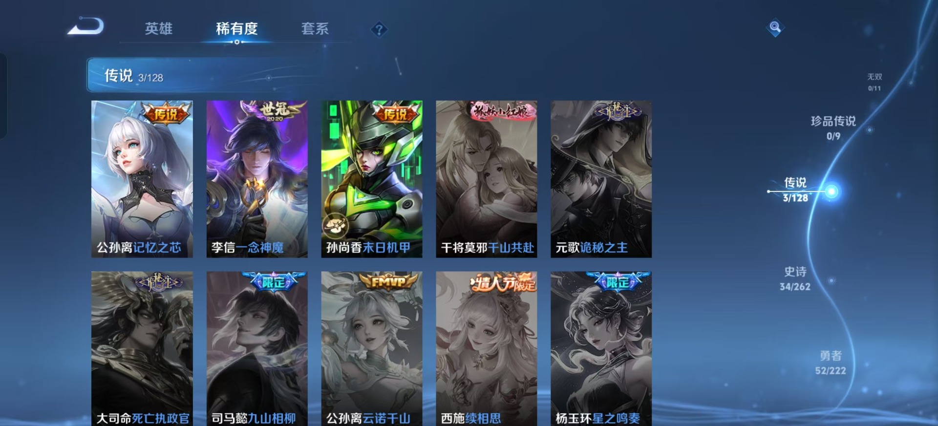 宫本武藏鬼剑武藏,刘邦德古拉伯爵,花木兰水晶猎龙者,李白千年之狐,安琪拉心灵骇客,白起星夜王子,伽罗箭羽风息,小乔缤纷独角兽,百里玄策原初追逐者,雅典娜冰冠公主,雅典娜黎明之约,李元芳逐浪之夏,项羽苍穹之光,墨子金属风暴,露娜紫霞仙子,吕布末日机甲,娜可露露晚萤,刘禅电玩·爆裂旋风,嫦娥拒霜思
