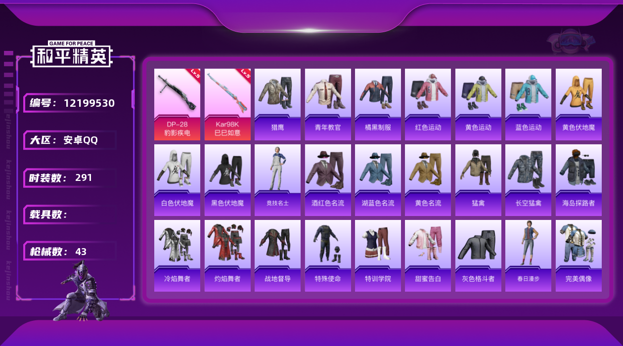 [12199530]2特效枪 1印记 可二次 可修改实名 优质装备:Kar98K-巳巳如意 稀有枪皮:DP-28-豹影疾电 五级特效枪:五级Kar98K-巳巳如意,五级DP-28-豹影疾电 紫色装扮:SS21特训,SS31特训套装,人气偶像,冷焰舞者,SS33特训套装,青涩时光,顶瓜瓜,都市漫游者,都市魅力,酒红色名流,长空猛禽,青年教官,蓝彩潮人,蓝色运动,街头潮人,魅力单车,麻辣教官,黄色伏地魔,黄色名流,黄色运动,黑色伏地魔,龟仙人,冰河战士,龙魂突击队,极速红龙,柠萌假日,橘黑制服,海岛探路者,深蓝色名流,幻影武者,完美偶像,帅气教官,幻世战舞者,战地督导,湖蓝色名流,绮丽涂鸦,疯狂小兔子,白色伏地魔,破晓战魂,破蛋小黄鸡,甜蜜告白,空岛之星,竞技达人朋克,红色运动,牛气冲天,灰色格斗者,灼焰舞者,牛气满满,猛禽,特殊使命,特训学院,猎鹰,SS28特训,玉兔迎春,竞技名士,街头风暴,银尘,焰鹰斗篷,幻羽潜行,SS27特训,SS26特训,大橘大利,耀粉歌者,春日漫步,SS32特训服(SS32特训套装),绯格组合,恋语绒绒