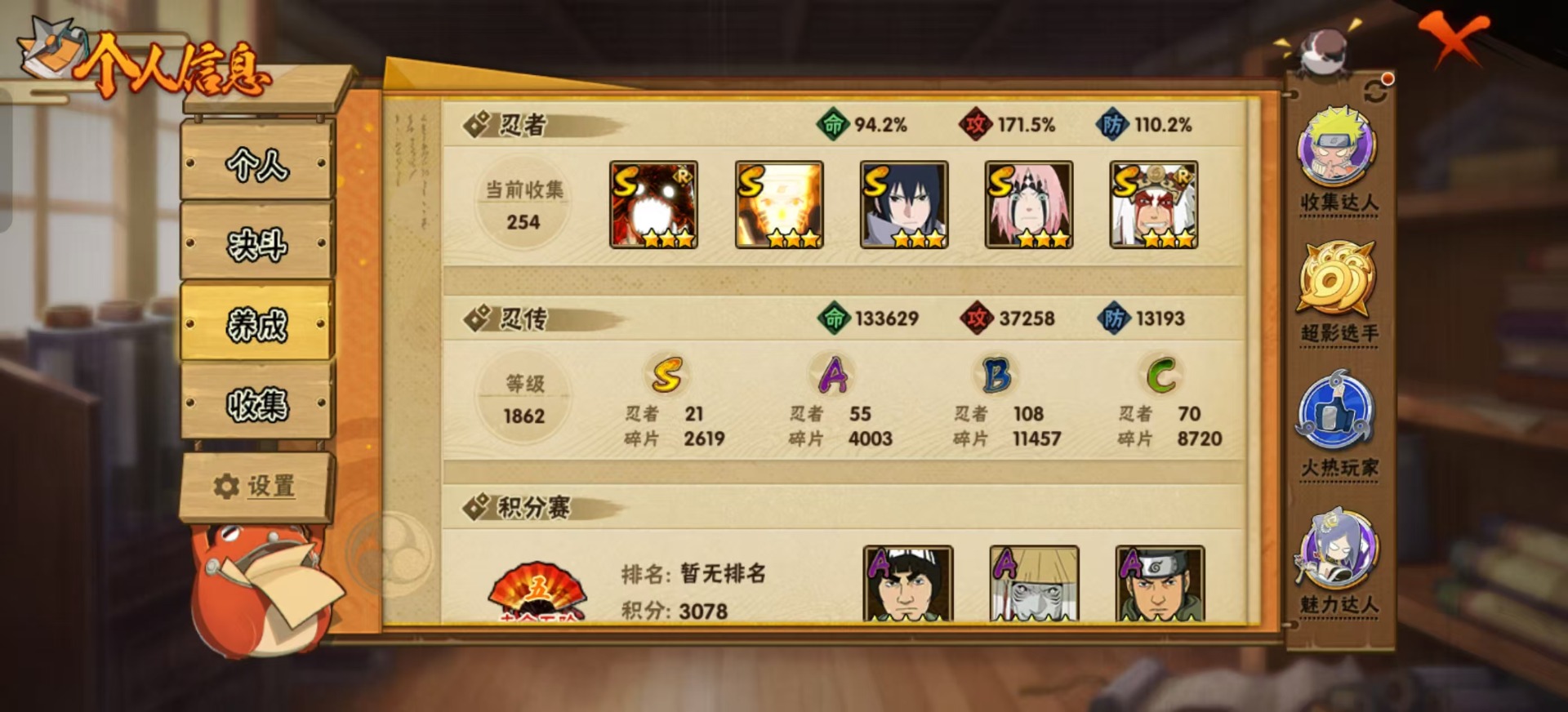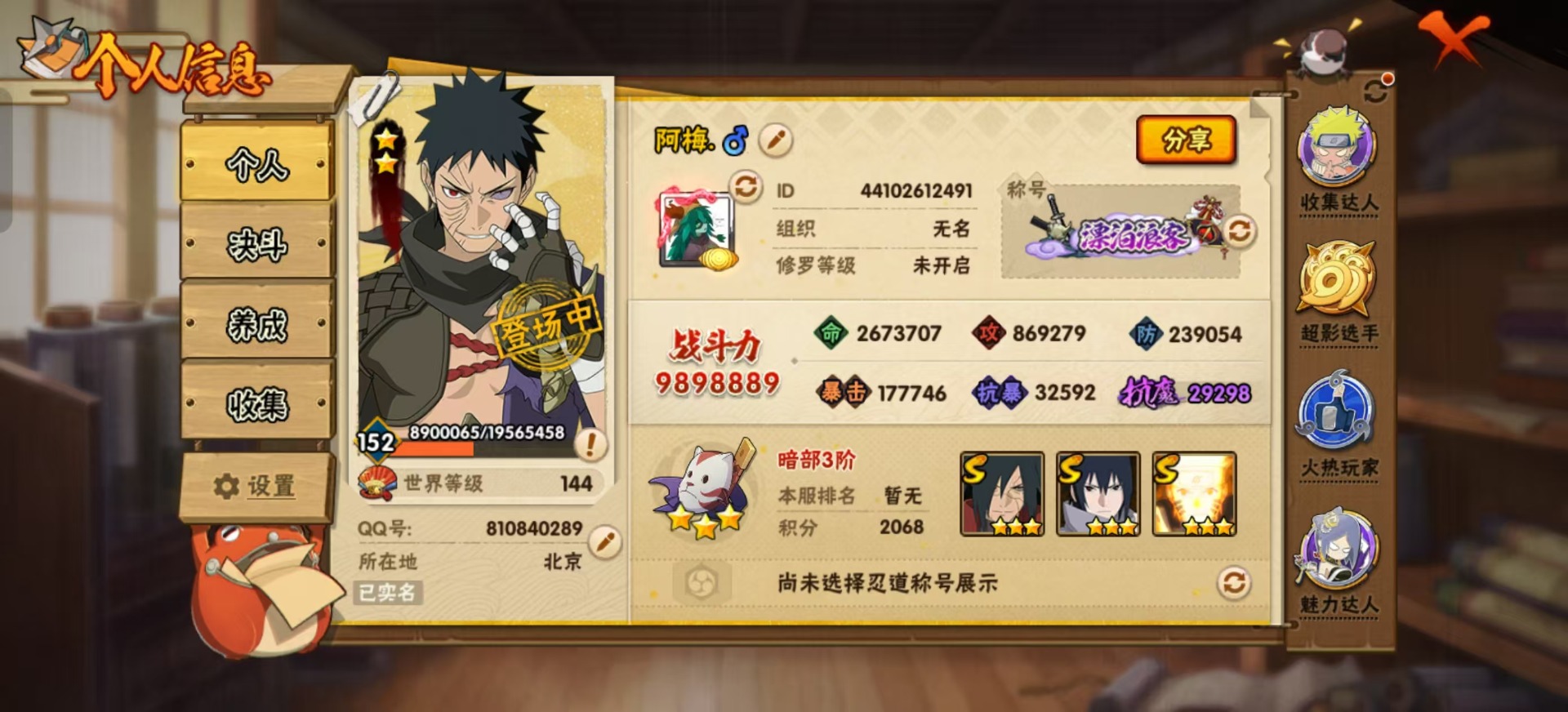 [12199537]V13 21S忍 50A忍 22通灵 989.8W战力 可二次 可修改实名 优质装备:熊猫,千手柱间「秽土转生」,宇智波鼬「秽土转生」,药师兜「仙人模式」,半藏「秽土转生」,宇智波斑,鬼灯幻月「二代目水影」,“宇智波斑” 「白面具」,漩涡鸣人 「九喇嘛连结」,春野樱 「忍界大战」,神秘面具男 「红夜之刃」,宇智波佐助「永恒万花筒」,千手柱间·木叶创立,宇智波斑「秽土转生·解」,大筒木桃式,艾「忍界大战」,漩涡鸣人 「暴怒·第六尾」 S级忍者:自来也 「舞之豪杰」,宇智波鼬 「须佐能乎」,佩恩「天道」,波风水门,大蛇丸
