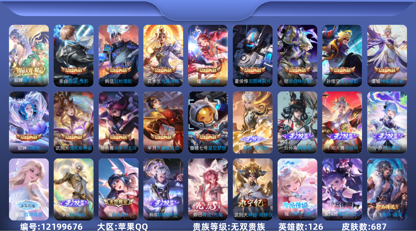 [12199676]无双贵族 13典藏 1珍品无双 10无双 7珍品传说 119传说 126英雄 687皮肤 可修改实名 优质装备:馥梦繁花,星空梦想(太空人),倪克斯神谕(宇宙婆娘),无限飓风号(高达),杀手不太冷,大秦宣太后,鸣剑·曳影,全息碎影(猴子典藏),九霄神辉(木兰典藏),银白咏叹调(倪克斯侍卫),幻阙歌(貂蝉典藏),弑枪猎影(韩信典藏),真我赫兹(瑶)(瑶无双),神器·明辉仪,青丘·九尾(妲己无双),碎月剑心(李白无双),神鉴启示录,小乔时之魔女(小乔无双),韩信群星魔术团(韩信无双),花合斗,离恨烟(公孙离无双),拾光映像(瑶典藏),雪境奇遇-甄姬,器灵·螭龙剑,江户川柯南,怪盗基德,器灵·落星盏,酷洛米之心,大耳狗之梦,黄金狮子座,黄金射手座,冠军飞将,云鹰飞将(小将军),绛天战甲(鸡嘴战神),黄金白羊座,猫影幻舞,久胜战神,炽阳神光,一念神魔,云霓雀翎,末日机甲-孙尚香(绿蚂蚱),地狱火,仲夏夜之梦(大飞蛾),音你心动-小乔,零号·赤焰,海洋之心,地狱之眼,飞鸢探春,音你心动-周瑜,胖达荣荣,李逍遥,乞巧织情,时之恋人-刘备(电焊工),游龙清影(小青龙),淬星耀世,超时空战士-狄仁杰,遇见胡旋,末日机甲-孙策,花朝如约(花篮子),挚爱之约,挚爱花嫁,无双飞将,音你闪耀(rap皮),碎云,天秀幻梦,神器·狴犴令,神器·明辉仪,山海·炽霜斩(李信年限),山海·琳琅生(小乔年限),山海·苍雷引(电光曜子),炽翼辉光(娃娃菜牛角包),燃星之曲,画中仙,浮生妄,记忆之芯(机甲兔),青丘·九尾,百相守梦(张飞),追逃游戏(亚瑟),电玩·雷克斯,鹤羽星尊,灼幽烈阳,妄想实况,妄想奇谈,鹤归松栖(云缨),惊梅引,遇见神鼓,鲁班七号-时之奇旅,大乔-时之奇旅,永恒水手月亮,夜礼服假面,霜月吟,澜逐花归海,艾琳觅芳踪,琥珀纪元铠,琥珀纪元马超,金乌负日,黄金天蝎座,云中君群星魔术团,朵莉亚心动手记,牧神诗旅,玄雷天君,千劫归真,涂山容容 珍品传说:时之奇旅-孙策,兔狲·蓬尾 传说皮:乘龙·问璇玑(孙尚香年限),乘龙·铭钟鼎(赵云年限),乘龙·淬吴钩(孙策年限),貂蝉曦玄引,吕布曦玄引,落雪白狼,云诺千山,铠冥王哈迪斯,星之鸣奏,幻光神枪 珍宝阁皮:妄想食味,胡桃夹子,万物之道,优雅恋人,蔷薇恋人,玩趣恶龙 限定皮:愿照·九州拓(澜年限),愿照·福禄聚(蔡文姬年限),愿照·岁时盈(虞