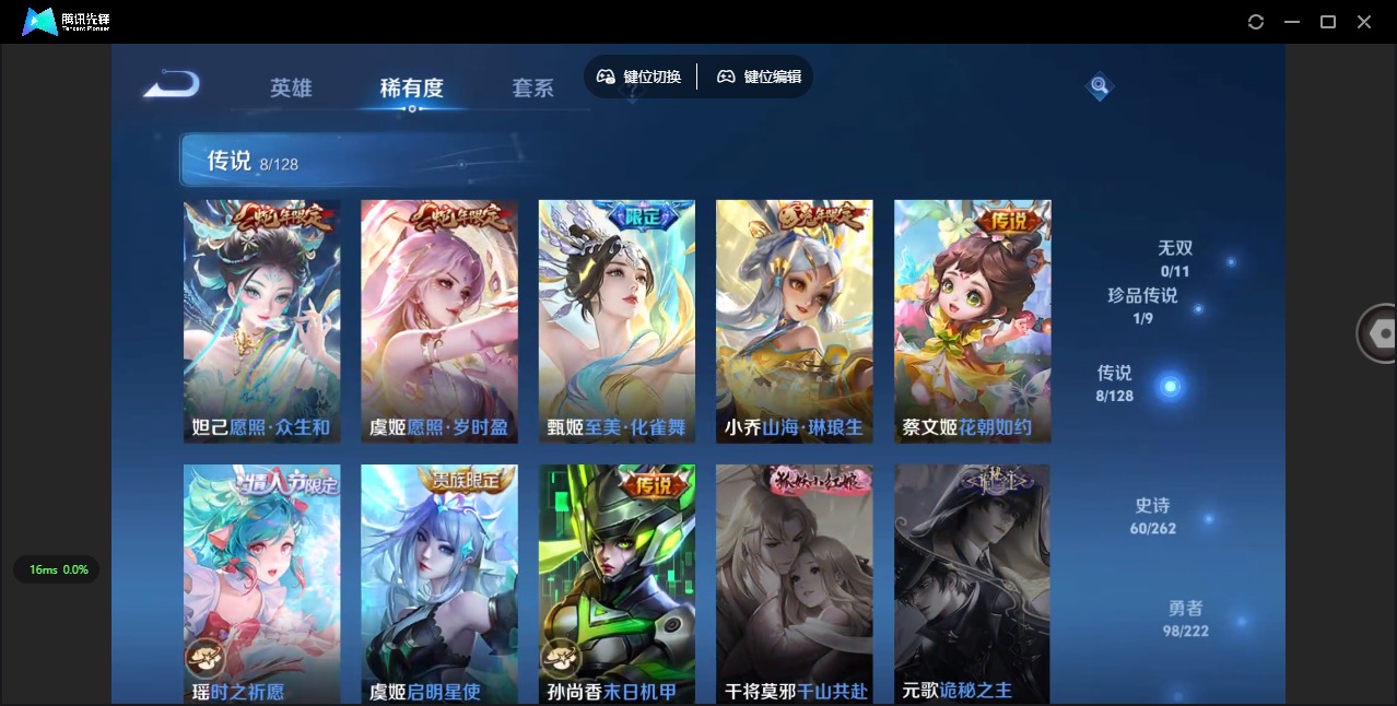 - PX_2097277-49 安卓QQ/至尊星耀/276皮肤/125英雄/1典藏/0珍品无双/1无双/3珍品传说/23传说/85史诗/9稀有英雄 【3 珍品传说】黑崎一护 宫本武藏,怪盗基德 马可波罗,时之奇旅 孙策, 【1 典藏皮肤】幻阙歌 貂蝉, 【1 无双皮肤】器灵·螭龙剑 曜, 【23 传说皮肤】启明星使 虞姬,云霓雀翎 虞姬,逐花归海 澜,云鹰飞将 曜,游龙清影 西施,猫影幻舞 貂蝉,地狱