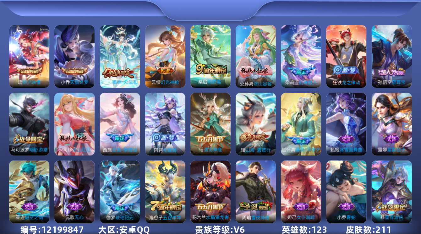 [12199847]V6 2典藏 3传说 123英雄 211皮肤 可修改实名 优质装备:天鹅之梦(小乔典藏),拾光映像(瑶典藏),涂山容容 传说皮:幻光神枪 珍宝阁皮:万物之道,蔷薇恋人 限定皮:愿照·众生和(妲己年限),鸣野蒿,至尊宝,山海·碧波行(瑶年限),至美·乘鲤谣,高山流水,五谷丰年 史诗皮:器灵·浮梦炉,化蝶舞,星界战将,龙之律动,茶境仙,幻珠鲛人,破空之剑,涂山红红,蒙犽顽岩魄,琥珀纪元伽罗,百相守梦-百里守约,遇见神鹿,紫霞仙子,江河有灵,雪夜绮愿(周瑜),百解令(蒙犽),冰冠公主,青蛇,偶像歌手,猫狗日记-孙策,女仆咖啡,摇滚巨星,水果甜心,绅士熊喵,星夜王子,心灵骇客,德古拉伯爵,心灵战警,舞动绿茵,地狱岩魂,拒霜思,缤纷独角兽,乘风破浪,逐浪之夏,月团寄思,水晶猎龙者,箭羽风息,金属风暴,原初追逐者,圣诞狂欢,圣诞恋歌,鹰眼统帅,魅力维加斯,无心