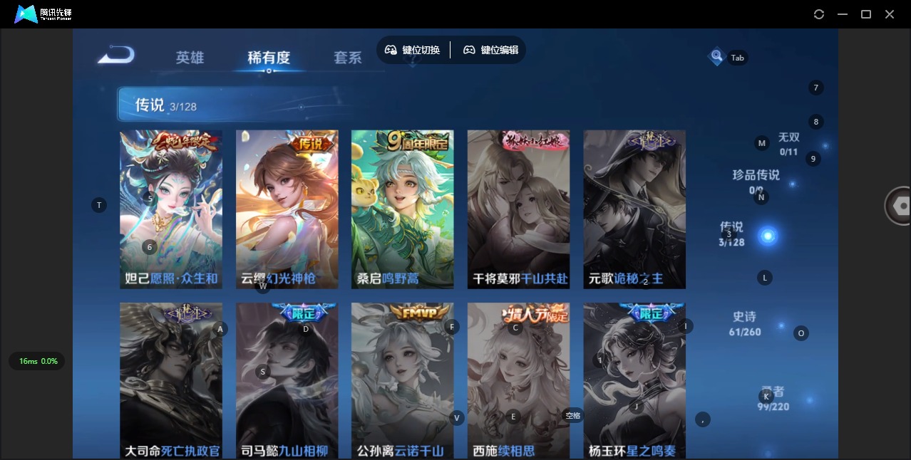 - PX_2096210-79 苹果QQ/至尊星耀/334皮肤/125英雄/1典藏/0珍品无双/0无双/0珍品传说/17传说/90史诗/9稀有英雄 【1 典藏皮肤】鸣剑·曳影 李白, 【17 传说皮肤】启明星使 虞姬,逐花归海 澜,无双飞将 马超,白虎志 百里玄策,凤求凰 李白,诗剑行 李白,仲夏夜之梦 貂蝉,炽阳神光 镜,霜月吟 露娜,怒海麟威 吕布,久胜战神 干将莫邪,末日机甲 孙尚香,一念神魔