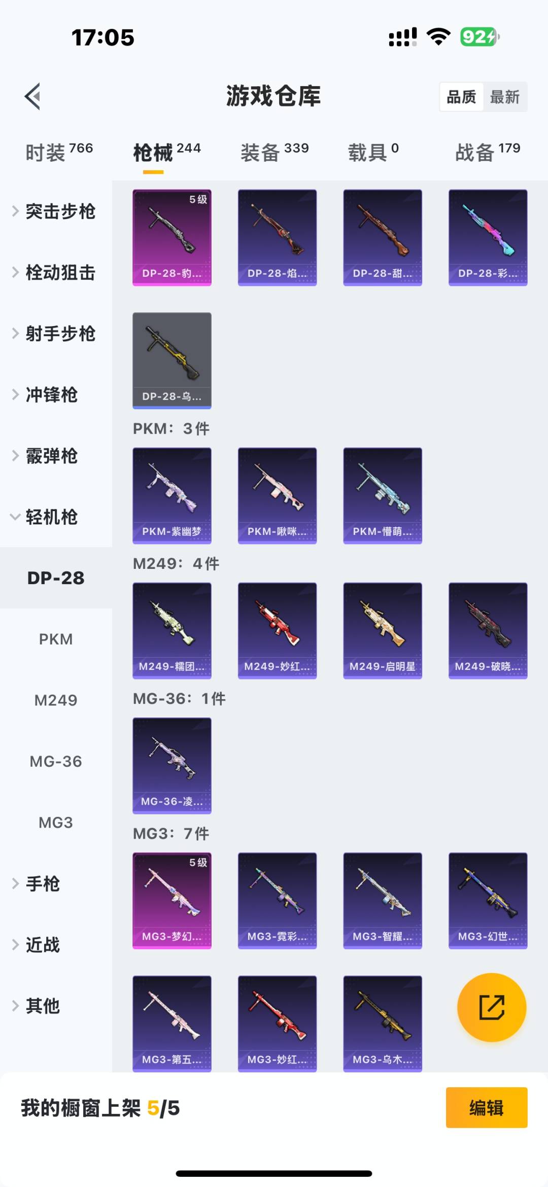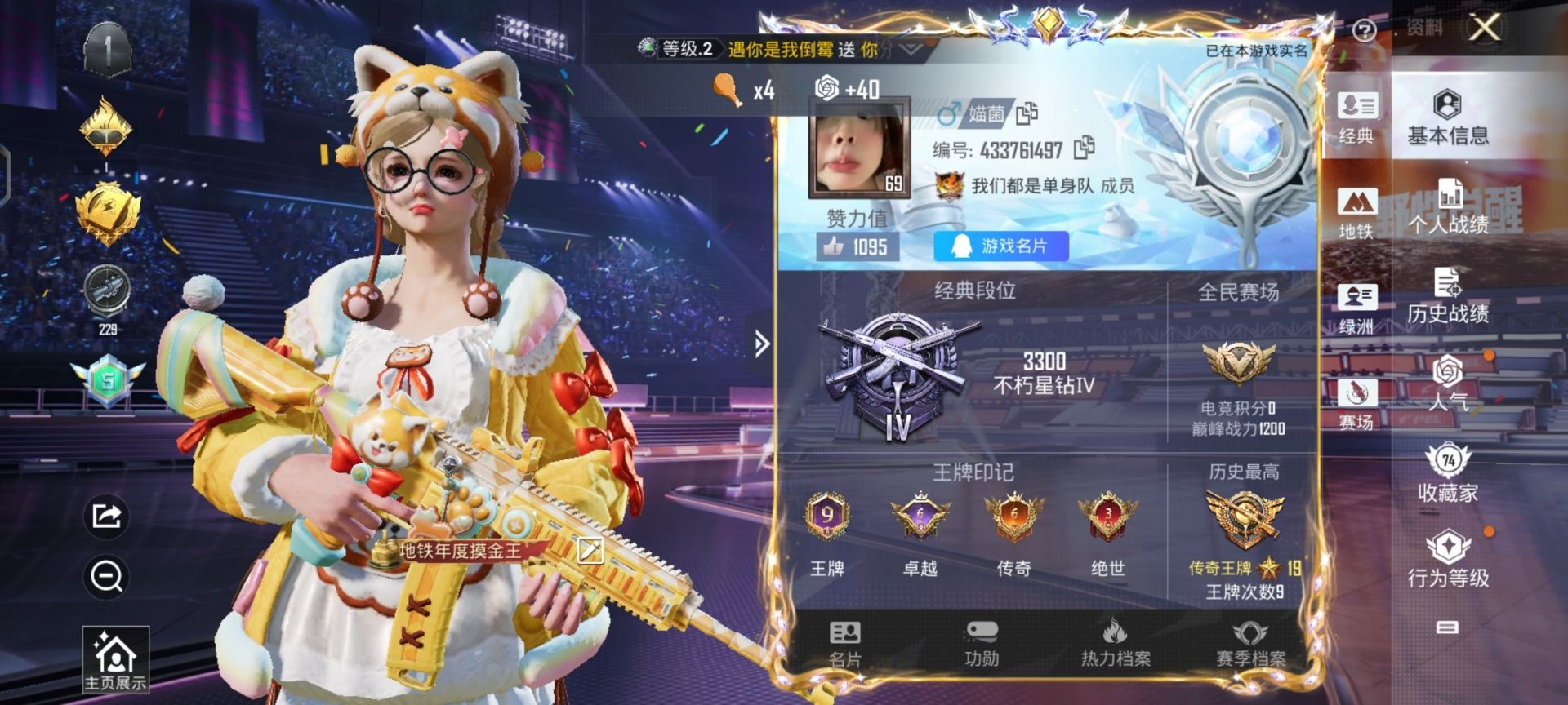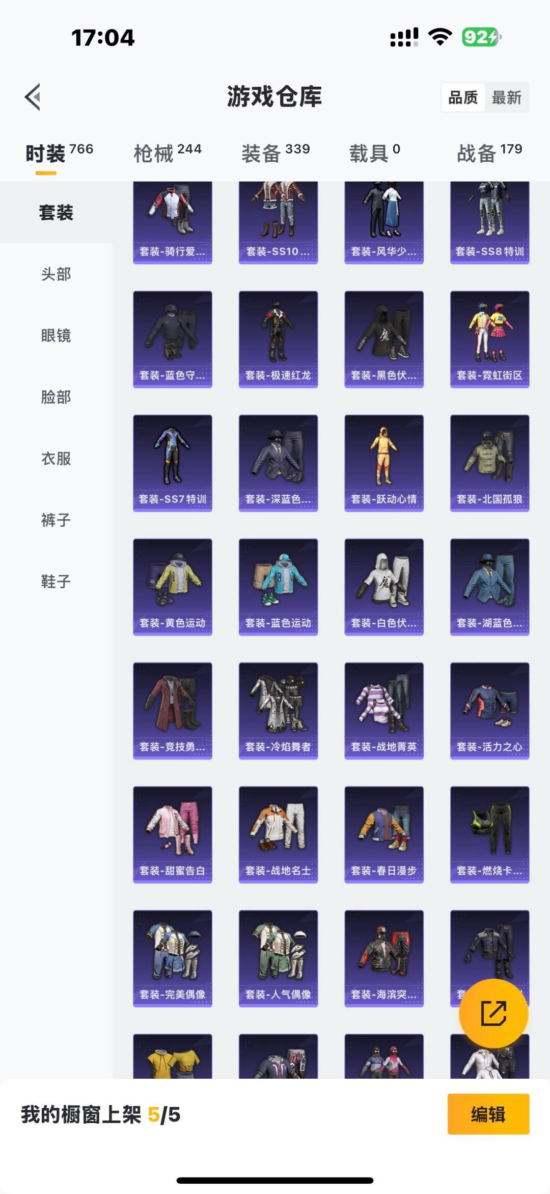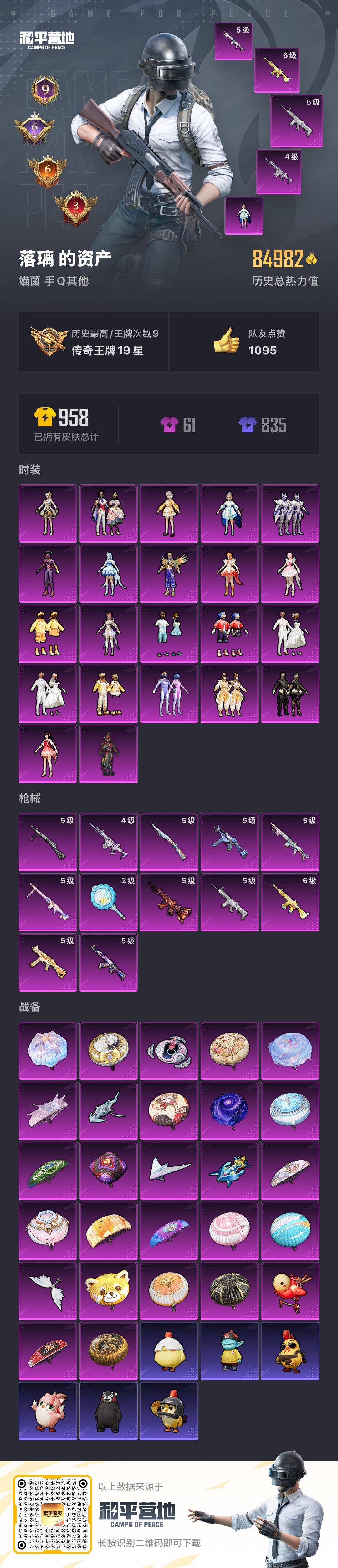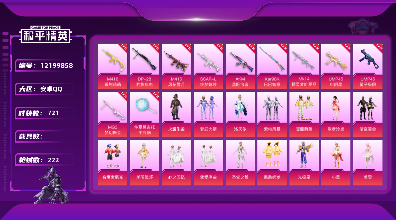 - [12062637]3粉装 6特效枪 12印记 可二次 可修改实名 身法装备:舞王派对(派对舞王、小金鞋),8号机(新粉螳螂) 优质装备:舞王派对(派对舞王、小金鞋),M416心之恋语,洛天依,AKM绿萝繁花,SCAR-L-锦绣绵绵,七级M416-心之恋语,UMP45量子极限,Kar98K-巳巳如意 热门装扮:炫光之旅,金丰海韵,梦魇先生,派对舞王(小金鞋) 稀有枪皮:DP-28-豹影疾电 五级特效枪:五级UMP45-量子极限,五级Kar98K-巳巳如意,五级DP-28-豹影疾电,五级SCAR-L-锦绣绵绵,五级AKM-绿萝繁花 紫色装扮:田园牧歌,轻风白浪,和煦暖阳,SS22特训,SS23特训,幻彩翩翩,妙红点点,娇憨猪猪,萌趣咩咩,SS21特训,绚烂繁星,SS31特训套装,六六大吉,冰川特警,霓虹热舞,旭日情侣,SS30特训套装,SS33特训套装,青涩时光,顶瓜瓜,SS20特训,SS16特训,萌趣颜团子,特种颜团子,猎梦纪元,飞驰魅影,音速流光,SS19特训,竞技角斗士,覆海蛟龙,甜心亚梦,虚音幻奏,瑞龙福将,团圆交子,SS17特训,冰川谧蓝,异彩先驱,SS18特训,都市漫游者,酒红色名流,野性战心,长空猛禽,霓虹极客,霓虹街区,缤纷果语,蓝色运动,虎虎生威吉莉,无面战甲,飞行日记,龙腾端午,骑行爱好者,鹤鸣,黄色名流,黄色运动,黎明保卫者,黑色伏地魔,龙的传人,龟仙人,冰河战士,龙魂突击队,蝶变,香桃花海,柠萌假日,沙漠兵团,活力之心,海岛探路者,滨海假日,幻影武者,幻世战舞者,探宝勇士,湖蓝色名流,滨海厨神,破晓战魂,甜蜜告白,福星高照,空岛之星,空投萌叽,红色运动,王牌教练,灰色格斗者,炫蓝之夏,热血青春,小熊娃娃,雏菊兔兔,萝兰蝴蝶,SS29特训,先驱飞行员,星途旅人,创世·幻影,纯真浪花,热情海星,曼妙人鱼,SS28特训,8号机(新粉螳螂),异域银装,鱼渊荷华,玉兔迎春,燕燕于飞,巳巳如意,风玲,青团波波,糖糖葫芦,棉花软糖,竞技名士,街头风暴,银尘,惊鸿侠骨,SS24特训(SS24特训套装),SS25特训,绝对偶像,金戈铁马,锦衣飞扬,粉红小猪,焰鹰斗篷,幻羽潜行,幽夜迷踪,SS27特训,明鸳圣池,日照花林,SS26特训,春光漫游,快闪甜心,贝斯之夜,智谋强哥,大橘大利,耀粉歌者,春日漫步,粉恋花,蓝冰羽,紫幽梦,SS32特训服(SS32特训套装),瑰梦爱神,绯格组合