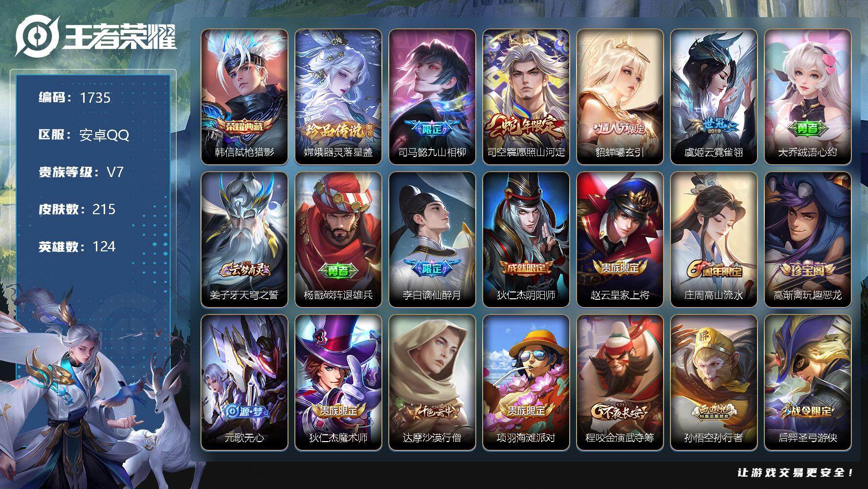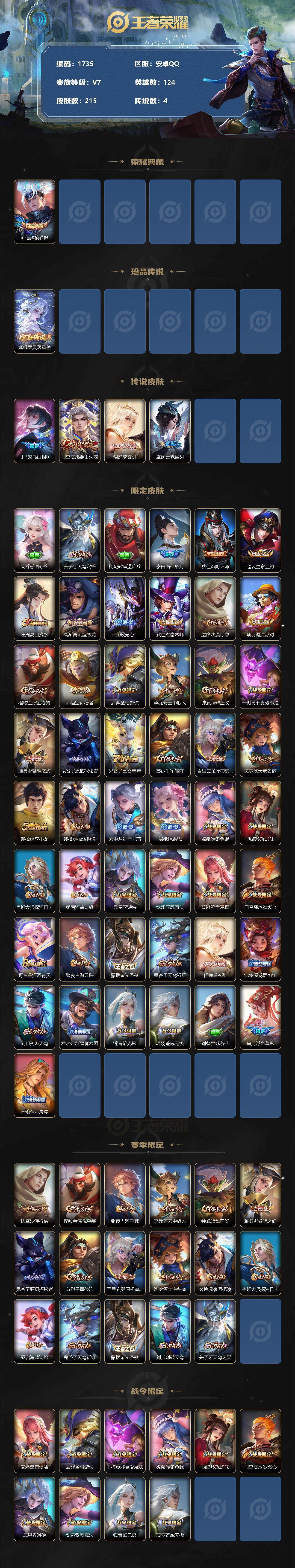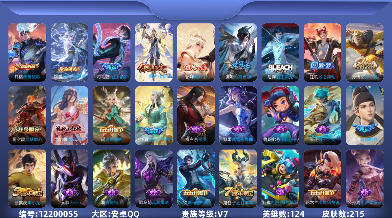 [12200055]【商品标题】:安卓Q-V7-永恒钻石III段位-124英雄-215皮肤-1典藏-0珍品无双-0无双-1珍品传说-4传说-65史诗