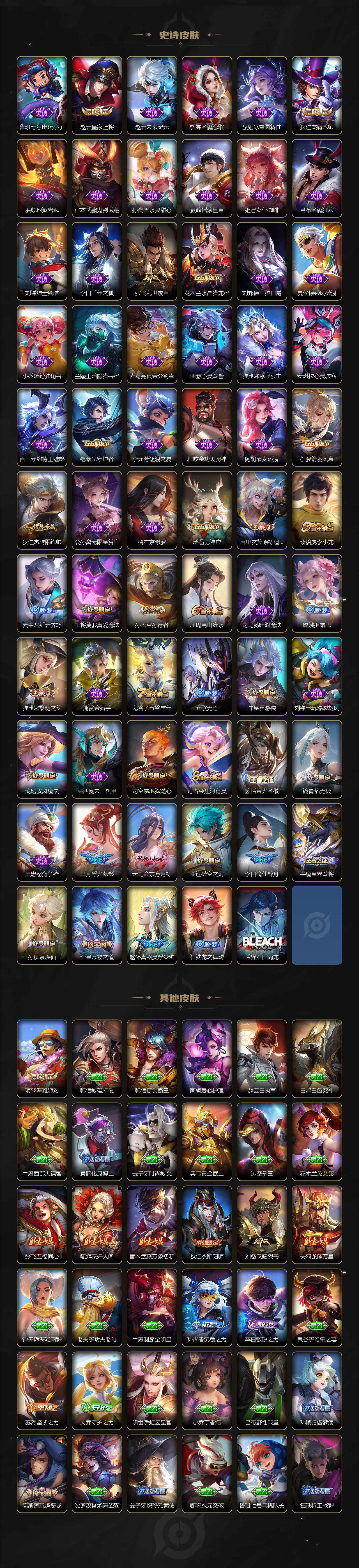 【史诗皮肤】:鲁班七号电玩小子,赵云皇家上将,赵云未来纪元,貂蝉圣诞恋歌,甄姬冰雪圆舞曲,狄仁杰魔术师,廉颇地狱岩魂,宫本武藏鬼剑武藏,孙尚香水果甜心,嬴政摇滚巨星,妲己女仆咖啡,吕布圣诞狂欢,刘禅绅士熊喵,李白千年之狐,张飞乱世虎臣,花木兰水晶猎龙者,刘邦德古拉伯爵,夏侯惇乘风破浪,小乔缤纷独角兽,兰陵王暗隐猎兽者,诸葛亮黄金分割率,亚瑟心灵战警,雅典娜冰冠公主,安琪拉心灵骇客,百里守约特工魅影,铠曙光守护者,李元芳逐浪之夏,程咬金功夫厨神,阿轲节奏热浪,伽罗箭羽风息,狄仁杰鹰眼统帅,公孙离无限星赏官,橘右京修罗,瑶遇见神鹿,百里玄策原初追逐者,裴擒虎李