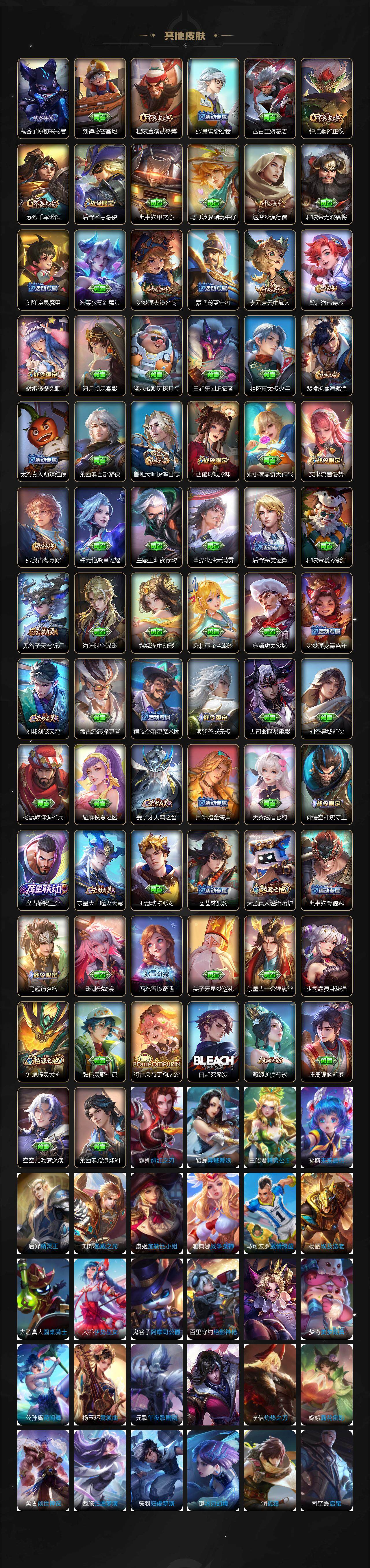 【限定皮肤】:大乔绒语心约,姜子牙天穹之誓,杨戬破阵退雄兵,李白谪仙醉月,狄仁杰阴阳师,赵云皇家上将,庄周高山流水,高渐离玩趣恶龙,元歌无心,狄仁杰魔术师,达摩沙漠行僧,项羽海滩派对,程咬金演武夺筹,孙悟空孙行者,后羿圣弓游侠,李元芳云中旅人,钟馗驱傩正仪,干将莫邪真爱魔法,雅典娜黎明之约,鬼谷子原初探秘者,鬼谷子五谷丰年,苏烈千军破阵,百里玄策原初追逐者,沈梦溪大漠名商,裴擒虎李小龙,裴擒虎擒涛扼浪,云中君纤云弄巧,嫦娥拒霜思,嫦娥暖冬兔眠,西施玲珑珍味,鲁班大师探海日志,桑启海盐诗旅,暃星界游侠,戈娅驭风魔法,艾琳流音漫舞,司空震地狱燃心,阿古朵江河有灵,张良古海寻踪,蒙恬荣光圣徽,鬼谷子天穹祈灯,貂蝉曦玄引,沈梦溪龙舞盛年,刘邦剑破天穹,程咬金群星魔术团,镜青焰无极,项羽苍威无极,刘备异域游侠,芈月浮光幕影,周瑜熔金海岸