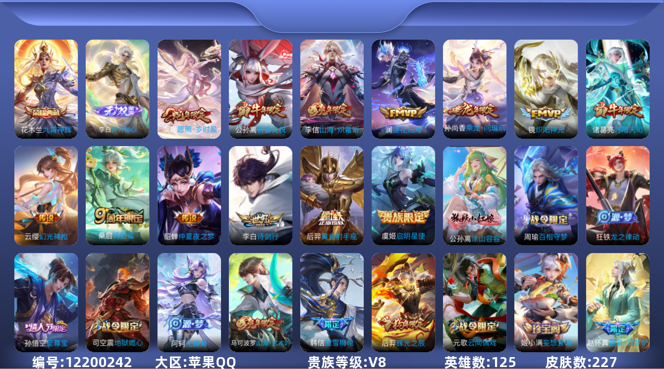 [12200242]V8 1典藏 1无双 13传说 125英雄 227皮肤 可修改实名 优质装备:九霄神辉(木兰典藏),碎月剑心(李白无双),黄金射手座,炽阳神光,仲夏夜之梦(大飞蛾),山海·炽霜斩(李信年限),澜逐花归海,涂山容容 传说皮:乘龙·问璇玑(孙尚香年限),幻光神枪 珍宝阁皮:妄想食味 限定皮:愿照·岁时盈(虞姬年限),鸣野蒿,至尊宝,傲雪梅枪,时雨天司(水龙头),遇见飞天,诗剑行,祈雪灵祝(雪兔子),辉光之辰,神器·万象笔,山海·玄木吟(马可年限) 史诗皮:器灵·浮梦炉,化蝶舞,龙之律动,琥珀纪元伽罗,星界战将,百相守梦-周瑜,茶境仙,怒海争锋,紫霞仙子,黄金分割率,特工魅影,冰冠公主,江河有灵,百解令(蒙犽),高渐离燃音魔法,蒙恬荣光圣徽,魅语,偶像歌手,末日机甲-吕布,猫狗日记-大乔,乱世虎臣,节奏热浪,修罗,摇滚巨星,水果甜心,绅士熊喵,天才门将,星夜王子,心灵骇客,功夫厨神,德古拉伯爵,暗隐猎兽者,幽灵船长,鬼剑武藏,心灵战警,天秀·启明,舞动绿茵,地狱岩魂,纤云弄巧,拒霜思,缤纷独角兽,乘风破浪,逐浪之夏,水晶猎龙者,曙光守护者,金属风暴,圣诞恋歌,鹰眼统帅,暗夜贵公子,魅力维加斯,黎明之约,无心