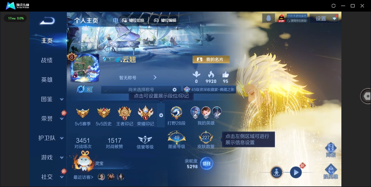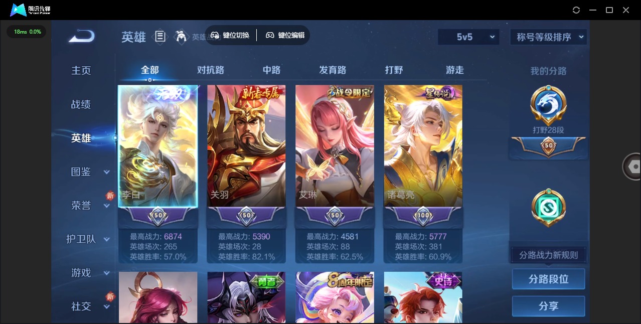 - [9925676]贵族V5 传说皮肤2 史诗皮肤30 皮肤数量138 皮肤价值:77852 英雄122 尊贵铂金II