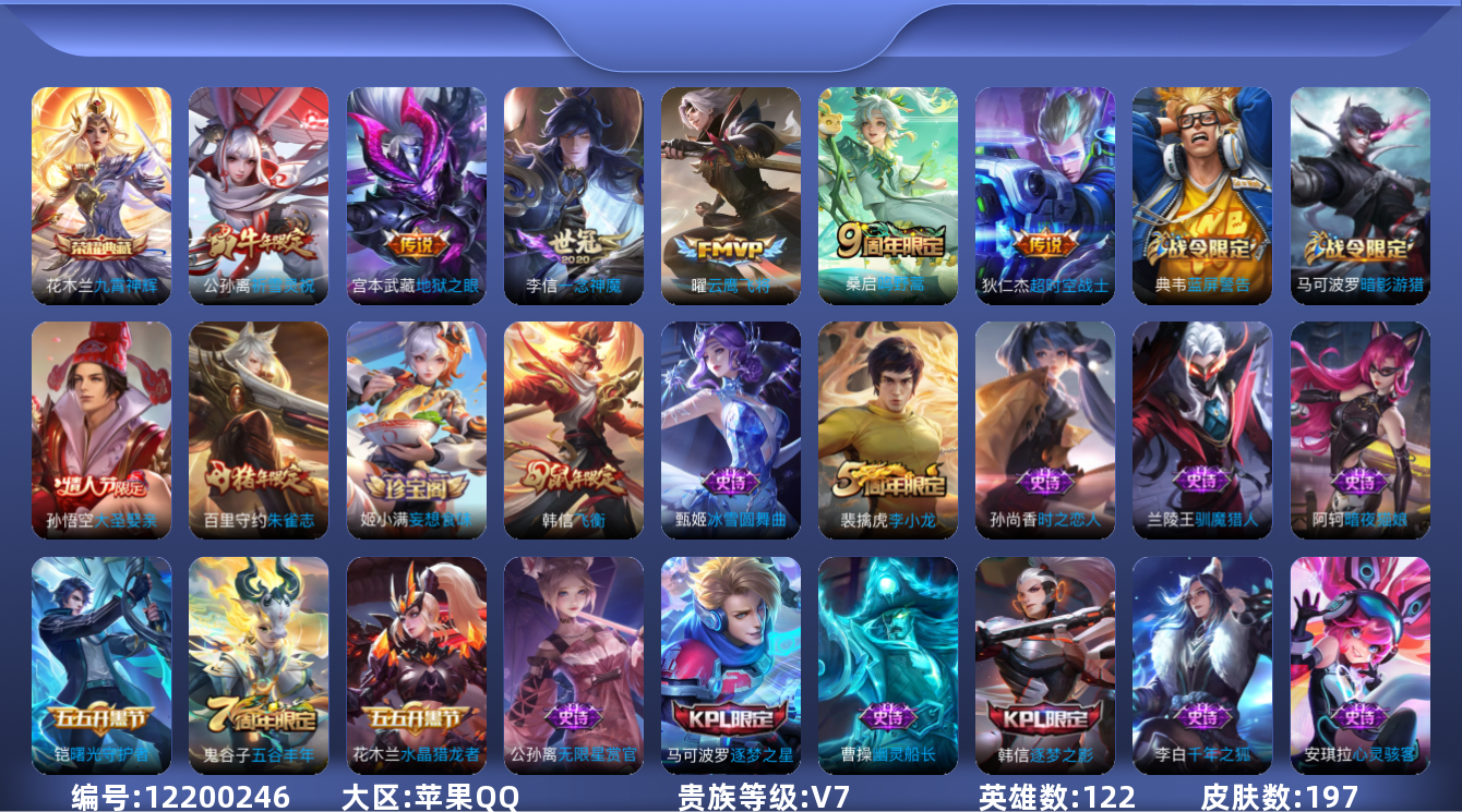 [12200246]V7 1典藏 6传说 122英雄 197皮肤 可修改实名 优质装备:九霄神辉(木兰典藏),云鹰飞将(小将军),一念神魔,地狱之眼,超时空战士-狄仁杰 珍宝阁皮:妄想食味,玩趣恶龙 限定皮:鸣野蒿,飞衡(韩信年限),高山流水,五谷丰年,游园惊梦,逐梦之星,祈雪灵祝(雪兔子),李小龙,逐梦之影,朱雀志(守约年限),大圣娶亲 史诗皮:特工魅影,千年之狐,百解令(蒙犽),高渐离燃音魔法,无限星赏官,偶像歌手,暗夜猫娘,时之恋人-孙尚香,乱世虎臣,水果甜心,天才门将,星夜王子,心灵骇客,功夫厨神,德古拉伯爵,暗隐猎兽者,幽灵船长,鬼剑武藏,心灵战警,纤云弄巧,缤纷独角兽,乘风破浪,逐浪之夏,水晶猎龙者,曙光守护者,金属风暴,原初追逐者,圣诞狂欢,圣诞恋歌,鹰眼统帅,王者之锤,魅力维加斯,黎明之约,未来纪元-赵云