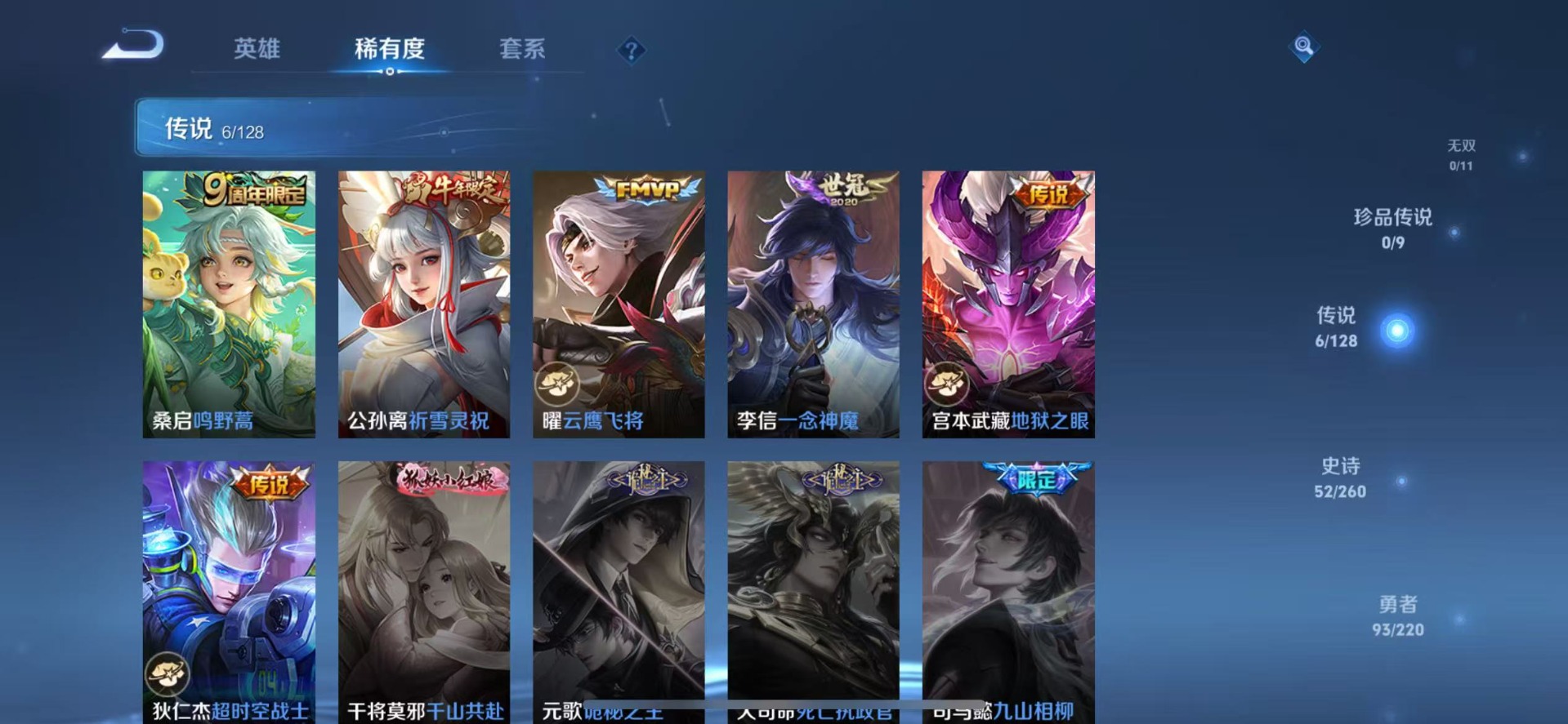 - PX_2084335-贵族等级: V7 英雄数: 95 皮肤数: 86 无双皮: 器灵·螭龙剑 珍品传说: 江户川柯南,怪盗基德 星传说: 幽冥之眼 传说皮: 久胜战神,地狱之眼,胖达荣荣,大乔-时之奇旅,星之鸣奏 限定皮: 鸣野蒿,逐霄战戟,愿照·众生和
