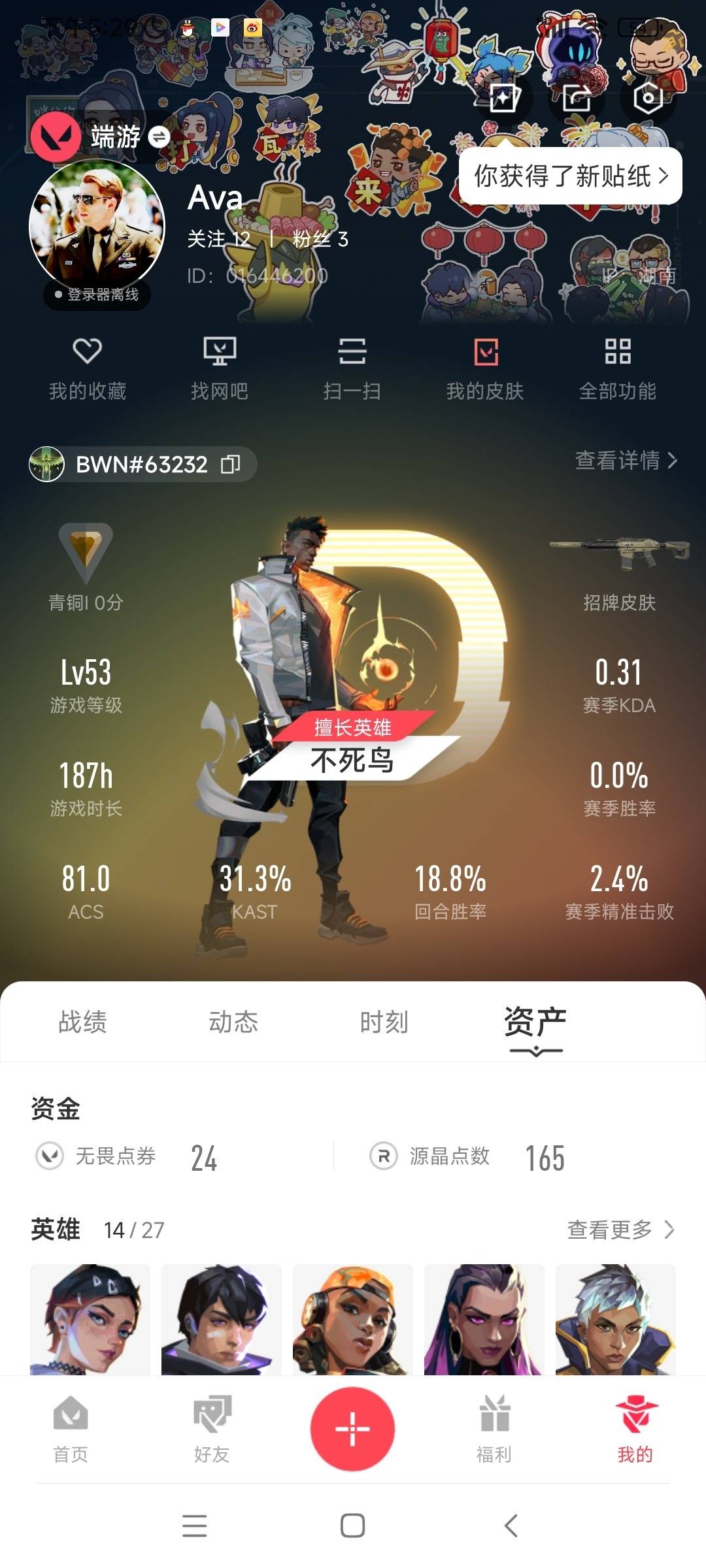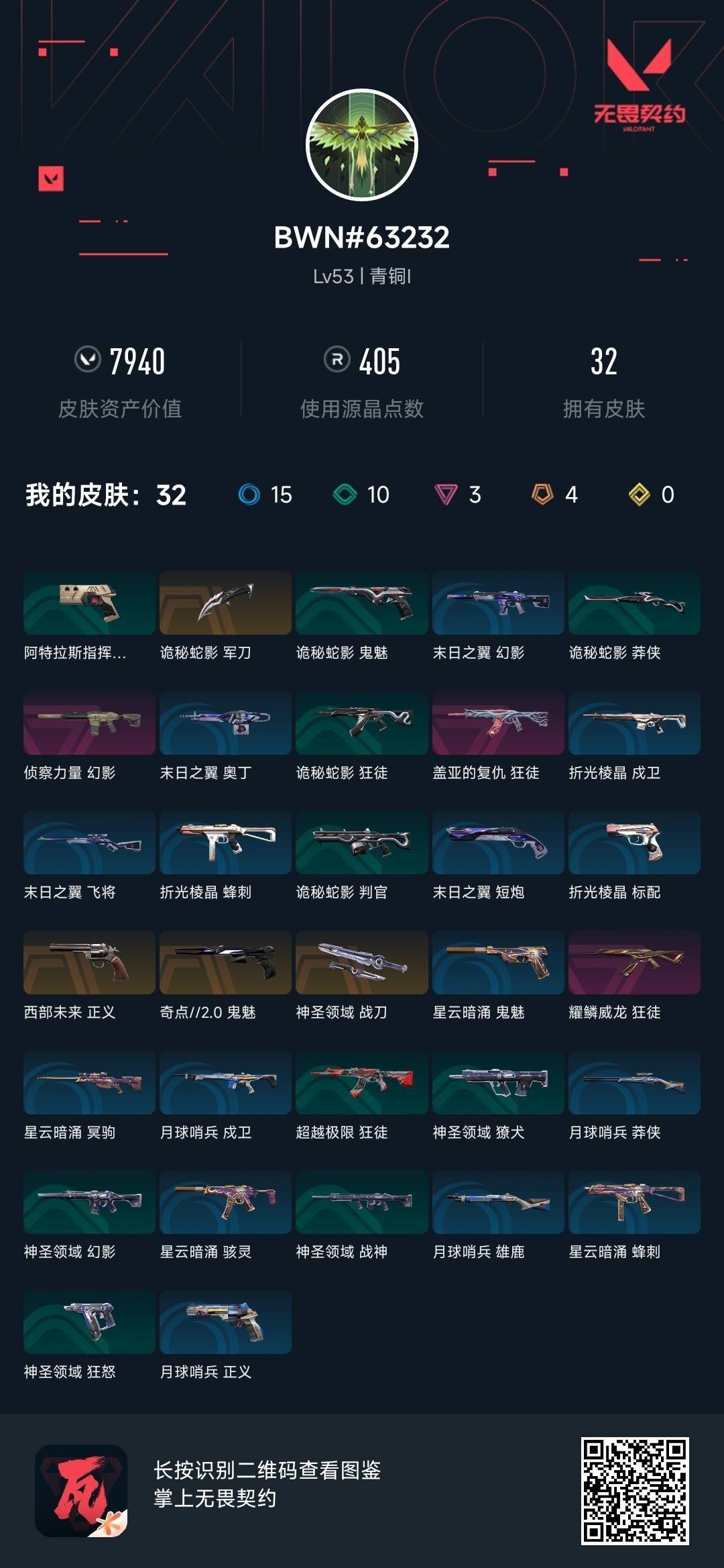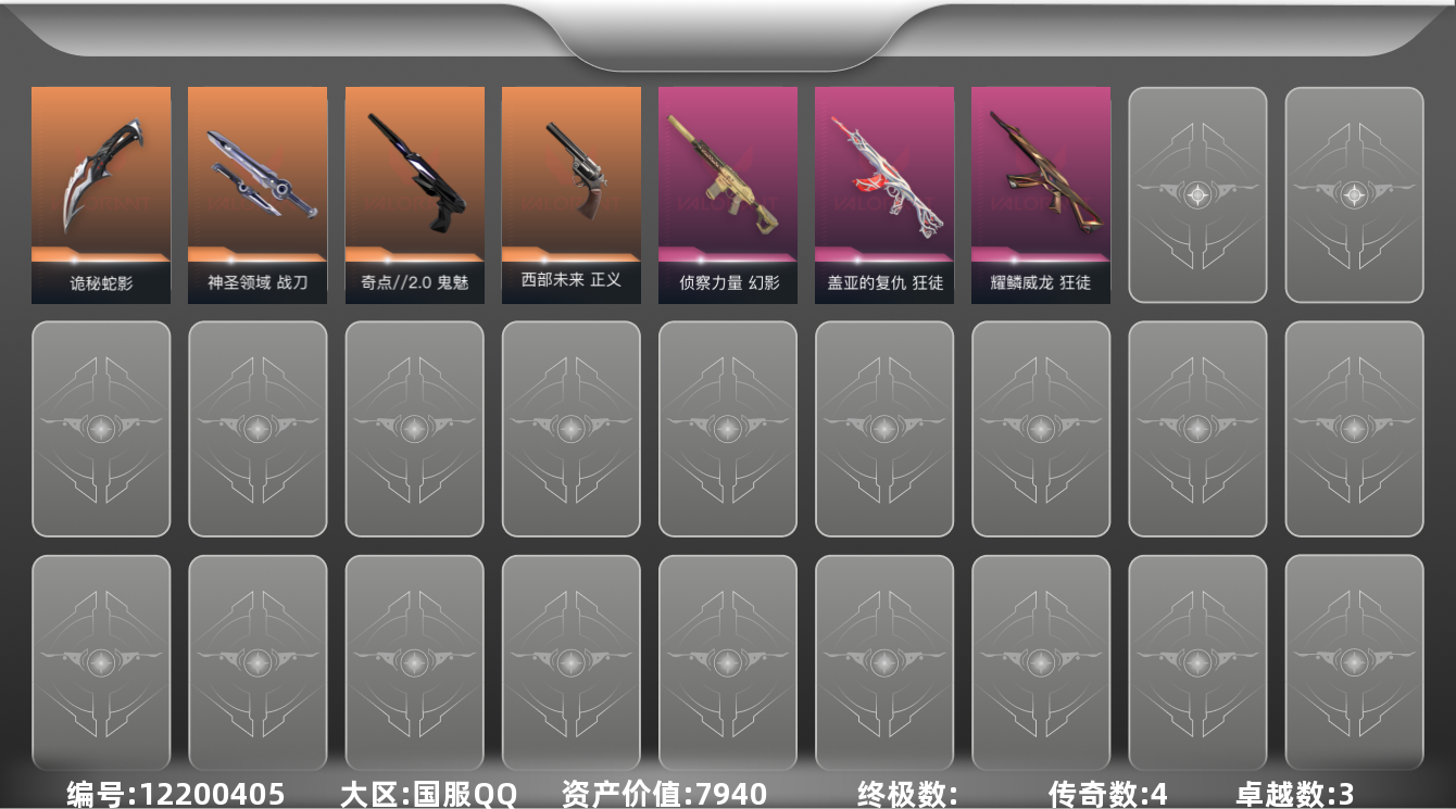 [12200405]4橙皮 3紫皮 32皮肤 14英雄 54卡面 405已用源晶 青铜 优质装备:狂徒-盖亚的复仇,幻影-侦察力量,狂徒-耀鳞威龙,鬼魅-奇点//2.0,神圣领域 战刀,诡秘蛇影 佩枪皮肤:正义-西部未来