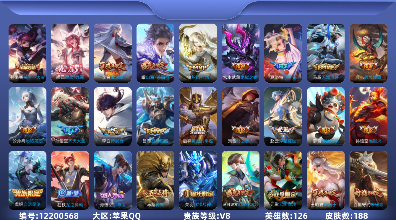 [12200568]V8 1典藏 1无双 17传说 126英雄 188皮肤 可修改实名 优质装备:杀手不太冷,青丘·九尾(妲己无双),黄金射手座,炽阳神光,地狱火,地狱之眼,胖达荣荣,时之恋人-刘备(电焊工),淬星耀世,无双飞将,山海·苍雷引(电光曜子),浮生妄,记忆之芯(机甲兔),青丘·九尾 传说皮:典韦战鼓燎原 限定皮:陌上桑,至尊宝,凤求凰(白切鸡),凤凰于飞,神威(电光马子),飞衡(韩信年限),诗剑行,齐天大圣,怒海麟威,五谷丰年,冰锋战神,朱雀志(守约年限),纯白花嫁,山海·玄木吟(马可年限) 史诗皮:龙之律动,紫霞仙子,苍穹之光,电玩小子(小书包),白蛇,高渐离燃音魔法,电玩·爆裂旋风,偶像歌手,龙骑士(小龙虾),暗夜猫娘,末日机甲-吕布,乱世虎臣,女仆咖啡,摇滚巨星,水果甜心,天才门将,心灵骇客,鬼剑武藏,心灵战警,乐园奇幻夜,缤纷独角兽,乘风破浪,逐浪之夏,水晶猎龙者,曙光守护者,金属风暴,原初追逐者,圣诞狂欢,圣诞恋歌,鹰眼统帅,魅力维加斯,赏金猎手,无心,未来纪元-赵云