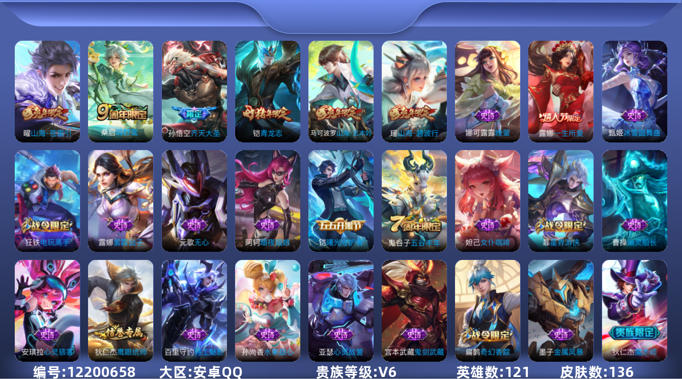 - [11131026]【商品标题】:安卓Q-V4-至尊星耀III段位-94英雄-114皮肤-0典藏-0珍品无双-0无双-0珍品传说-2传说-31史诗 【内测皮肤】:狂铁特工战影 【传说皮肤】:马超无双飞将,桑启鸣野蒿 【限定皮肤】:姜子牙天穹之誓,杨戬破阵退雄兵,狄仁杰阴阳师,赵云皇家上将,项羽海滩派对,韩信傲雪梅枪,百里玄策原初追逐者,高渐离燃音魔法,妲己灵卜魔法,鬼谷子天穹祈灯,伽罗琥珀纪元,沈梦溪龙舞盛年,鲁班七号蔬乡物语,李元芳蔬乡物语,刘邦剑破天穹,程咬金群星魔术团,关羽决胜骁骑,镜青焰无极,项羽苍威无极,刘备异域游侠,周瑜熔金海岸 【赛季限定】:百里玄策原初追逐者,鬼谷子天穹祈灯,刘邦剑破天穹,姜子牙天穹之誓 【战令限定】:高渐离燃音魔法,妲己灵卜魔法,鲁班七号蔬乡物语,李元芳蔬乡物语,镜青焰无极,项羽苍威无极 【史诗皮肤】:露娜紫霞仙子,赵云皇家上将,王昭君偶像歌手,宫本武藏鬼剑武藏,孙尚香水果甜心,妲己魅力维加斯,妲己女仆咖啡,刘禅绅士熊喵,吕布末日机甲,花木兰水晶猎龙者,小乔缤纷独角兽,亚瑟心灵战警,铠曙光守护者,刘禅天才门将,白起星夜王子,阿轲节奏热浪,伽罗箭羽风息,狄仁杰鹰眼统帅,不知火舞魅语,百里玄策原初追逐者,韩信傲雪梅枪,妲己灵卜魔法,高渐离燃音魔法,伽罗琥珀纪元,鲁班七号蔬乡物语,镜青焰无极,关羽决胜骁骑,百里守约百相守梦,牛魔星界战将,孙膑茶境仙,阿轲化蝶舞,刘禅鸭鸭历险记,狂铁龙之律动 【其他皮肤】:项羽海滩派对,韩信街头霸王,露娜哥特玫瑰,赵云白执事,赵云忍炎影,芈月红桃皇后,白起白色死神,妲己少女阿狸,典韦黄金武士,亚瑟死亡骑士,花木兰兔女郎,后羿阿尔法小队,狄仁杰阴阳师,关羽龙腾万里,王昭君幻想奇妙夜,苏烈坚韧之力,狂铁特工战影,刘禅秘密基地,蒙犽胡桃狂想曲,戈娅危途狂花,刘备潮玩造梦师,赵怀真太极少年,莱西奥西部游侠,李元芳妄想特派,鬼谷子天穹祈灯,妲己灵卜魔法,嫦娥漠中幻影,亚瑟鸿运当头,沈梦溪龙舞盛年,钟无艳春野之旅,李元芳蔬乡物语,扁鹊无尽旅途,刘邦剑破天穹,盘古经纬探寻者,程咬金群星魔术团,项羽苍威无极,大司命暗都幽影,刘备异域游侠,杨戬破阵退雄兵,姜子牙天穹之誓,周瑜熔金海岸,东皇太一噬灭天穹,老夫子百相守梦,干将莫邪雾都夜雨,吕布逐霄战戟,苍苍林狼骑,太乙真人谧流熔炉,典韦铁骨偃魂,马超访茗客,西施雪境奇遇,姜子牙星梦巡礼,达摩爆裂