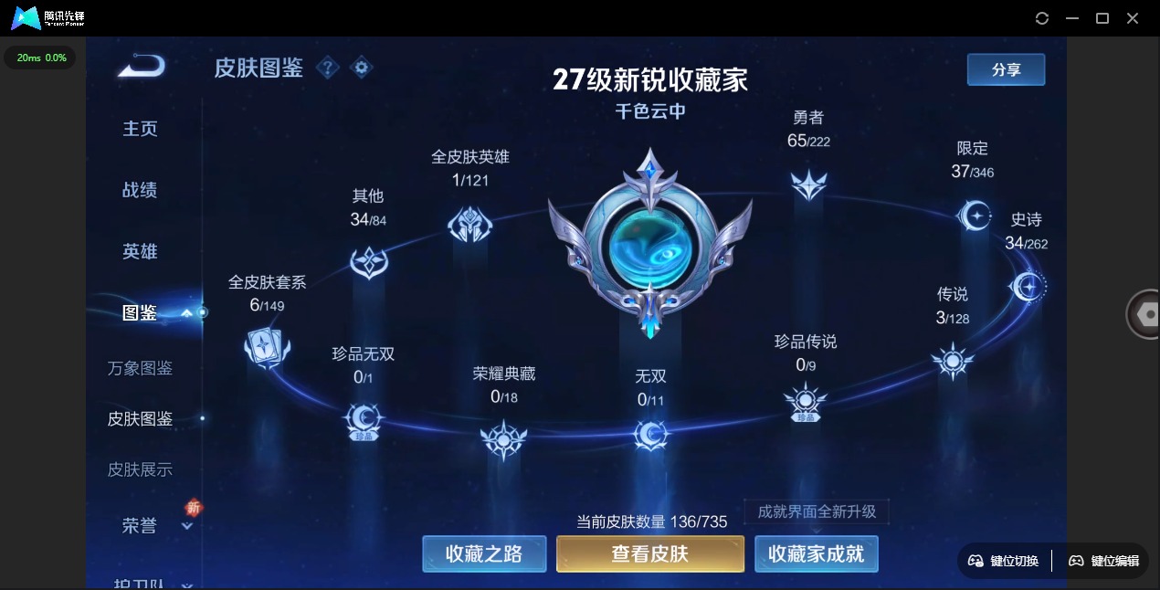 - [11682794]V7 2典藏 4传说 124英雄 246皮肤 可修改实名 安全保护中 荣耀水晶:最初的交响(伽罗典藏),幻阙歌(貂蝉典藏) 传说皮:仲夏夜之梦(大飞蛾),地狱之眼,神器·狴犴令,妄想实况 珍宝阁皮:优雅恋人,玩趣恶龙 限定皮:高山流水,五谷丰年,李小龙,神器·万象笔 史诗皮:茶境仙,器灵·浮梦炉,化蝶舞,蔬乡物语(鲁班七号),紫霞仙子,苍穹之光,特工魅影,千年之狐,永昼,电玩·爆裂旋风,电玩·兔顽号,冰冠公主,江河有灵,蒙恬荣光圣徽,偶像歌手,暗夜猫娘,龙骑士(小龙虾),乱世虎臣,节奏热浪,修罗,女仆咖啡,摇滚巨星,水果甜心,绅士熊喵,天才门将,星夜王子,功夫厨神,德古拉伯爵,暗隐猎兽者,幽灵船长,鬼剑武藏,舞动绿茵,地狱岩魂,缤纷独角兽,乘风破浪,逐浪之夏,水晶猎龙者,箭羽风息,唤灵魅影,金属风暴,原初追逐者,圣诞狂欢,圣诞恋歌,鹰眼统帅,魅力维加斯,黎明之约,赏金猎手,奇遇舞章,无心,未来纪元-赵云