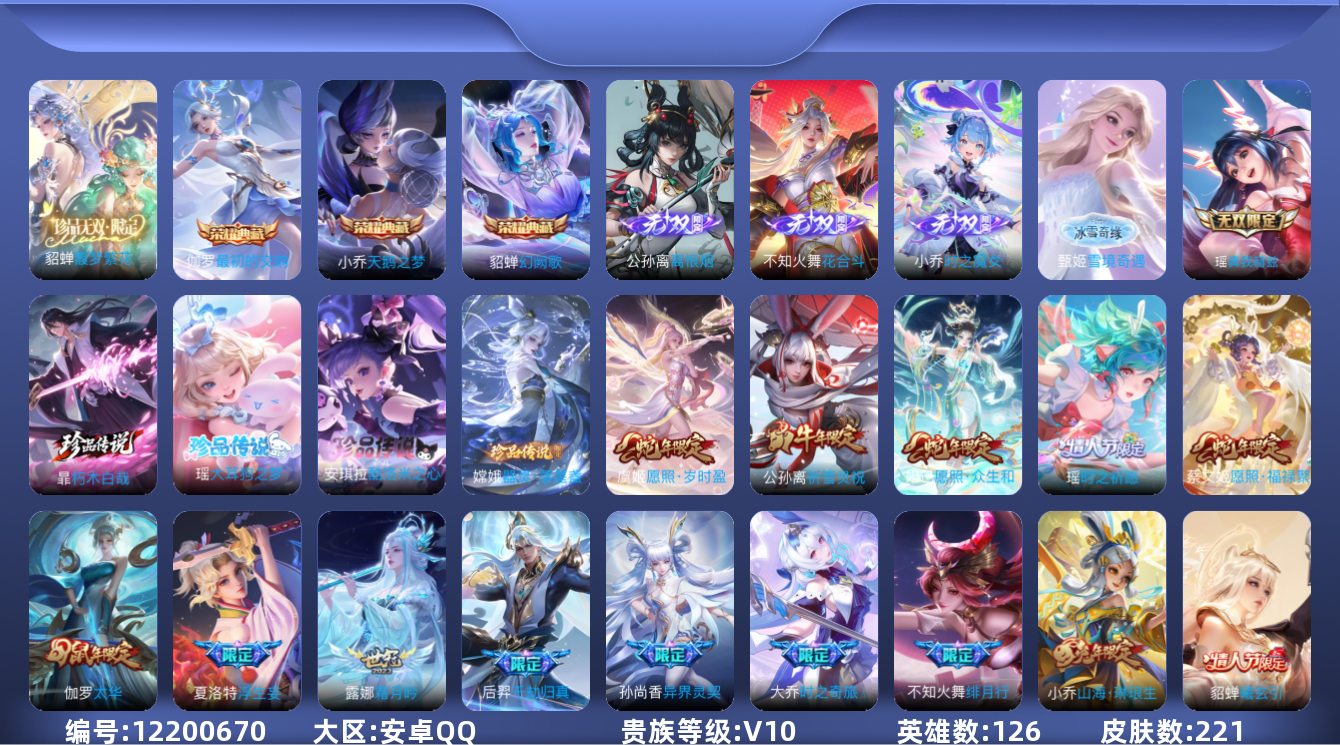 [12200670]V10 3典藏 1珍品无双 5无双 4珍品传说 26传说 126英雄 221皮肤 可修改实名 优质装备:馥梦繁花,天鹅之梦(小乔典藏),幻阙歌(貂蝉典藏),真我赫兹(瑶)(瑶无双),小乔时之魔女(小乔无双),花合斗,离恨烟(公孙离无双),雪境奇遇-甄姬,最初的交响(伽罗典藏),器灵·落星盏,酷洛米之心,大耳狗之梦,朽木白哉,猫影幻舞,久胜战神,仲夏夜之梦(大飞蛾),乞巧织情,花朝如约(花篮子),山海·琳琅生(小乔年限),浮生妄,灼幽烈阳,妄想奇谈,大乔-时之奇旅,霜月吟,艾琳觅芳踪,千劫归真 传说皮:貂蝉曦玄引 限定皮:愿照·福禄聚(蔡文姬年限),愿照·岁时盈(虞姬年限),愿照·众生和(妲己年限),映山客,鸣野蒿,太华(伽罗年限),异界灵契(白毛香),绯月行,至美·乘鲤谣,至美·化雀舞,岱宗(典韦年限),虎魄,逐梦之音,祈雪灵祝(雪兔子),寅虎·心曲(虎婆),时之祈愿-瑶(瑶传限),玉兔公主 史诗皮:鸭鸭历险记-刘禅,化蝶舞,龙之律动,灵蛊蚀心,星界战将,百相守梦-周瑜,茶境仙,破空之剑,战舞者,曹操夜都魔契,织梦人,紫霞仙子,特工魅影,千年之狐,白蛇,浮梦罗烟,青蛇,魅语,晚萤,偶像歌手,银翎春语,龙骑士(小龙虾),暗夜猫娘,末日机甲-吕布,猫狗日记-大乔,乱世虎臣,节奏热浪,女仆咖啡,摇滚巨星,水果甜心,天才门将,星夜王子,心灵骇客,时之奇旅-安琪拉,德古拉伯爵,鬼剑武藏,舞动绿茵,诗语江南,拒霜思,缤纷独角兽,乘风破浪,曙光守护者,箭羽风息,唤灵魅影,圣诞狂欢,圣诞恋歌,魅力维加斯,天秀·音浪,未来纪元-赵云