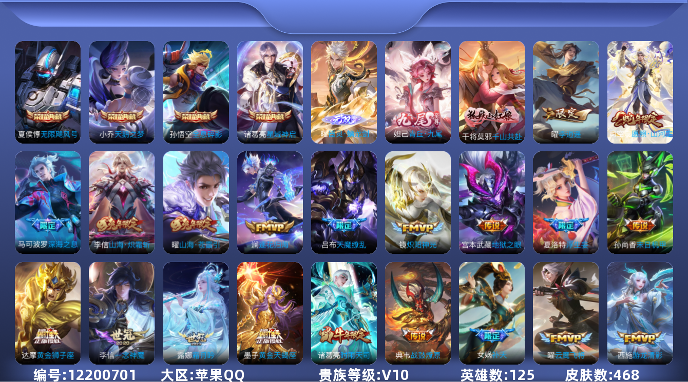 [12200701]V10 4典藏 2无双 43传说 125英雄 468皮肤 可修改实名 优质装备:天鹅之梦(小乔典藏),无限飓风号(高达),全息碎影(猴子典藏),星域神启(倪克斯贼亮),青丘·九尾(妲己无双),器灵·螭龙剑,黄金狮子座,黄金射手座,冠军飞将,云鹰飞将(小将军),炽阳神光,一念神魔,末日机甲-孙尚香(绿蚂蚱),地狱火,仲夏夜之梦(大飞蛾),音你心动-小乔,零号·赤焰,地狱之眼,李逍遥,乞巧织情,时之恋人-刘备(电焊工),游龙清影(小青龙),超时空战士-狄仁杰,碎云,山海·炽霜斩(李信年限),山海·苍雷引(电光曜子),燃星之曲,浮生妄,青丘·九尾,灼幽烈阳,惊梅引,遇见神鼓,霜月吟,澜逐花归海,艾琳觅芳踪,琥珀纪元铠,黄金天蝎座,千山共赴,涂山容容 传说皮:典韦战鼓燎原,幻光神枪 珍宝阁皮:妄想食味,优雅恋人,蔷薇恋人 限定皮:愿照·山河定(司空震年限),逐霄战戟,鸣野蒿,至尊宝,傲雪梅枪,补天,白晶晶,时雨天司(水龙头),神威(电光马子),遇见飞天,高山流水,诗剑行,怒海麟威,五谷丰年,青龙志(铠年限),冰锋战神,游园惊梦,梁祝,御风骁将(吕布年限),天狼狩猎者,龙胆,逐梦之星,岱宗(典韦年限),奔雷神使(牛魔年限),李小龙,逐梦之影,玄武志(苏烈年限),朱雀志(守约年限),霸王别姬-项羽,大圣娶亲,引擎之心,天魔缭乱,青春决赛季,云端筑梦师,美猴王,女儿国国王,深海之息(深海大菠萝),枫霜尽,山海·玄木吟(马可年限) 史诗皮:鸭鸭历险记-刘禅,器灵·浮梦炉,化蝶舞,灵蛊蚀心,星界战将,龙之律动,石田雨龙,茶境仙,怒海争锋,破空之剑,蒙犽顽岩魄,琥珀纪元伽罗,蔬乡物语(鲁班七号),百相守梦-百里守约,紫霞仙子,苍穹之光,电玩小子(小书包),黄金分割率,特工魅影,千年之狐,江河有灵,鹤归松栖(赵怀真),雪夜绮愿(周瑜),完美假期,魅语,百解令(蒙犽),高渐离燃音魔法,蒙恬荣光圣徽,无限星赏官,匿光破解者,冰冠公主,青蛇,偶像歌手,白蛇,晚萤,电玩·爆裂旋风,百相守梦(刘备),暗夜猫娘,龙骑士(小龙虾),末日机甲-吕布,猫狗日记-孙策,猫狗日记-大乔,时之恋人-孙尚香,乱世虎臣,节奏热浪,修罗,女仆咖啡,摇滚巨星,水果甜心,绅士熊喵,天才门将,星夜王子,心灵骇客,时之奇旅-安琪拉,功夫厨神,德古拉伯爵,暗隐猎兽者,幽灵船长,鬼剑武藏,暗渊魔法,心灵战警,乐园奇幻夜,天秀