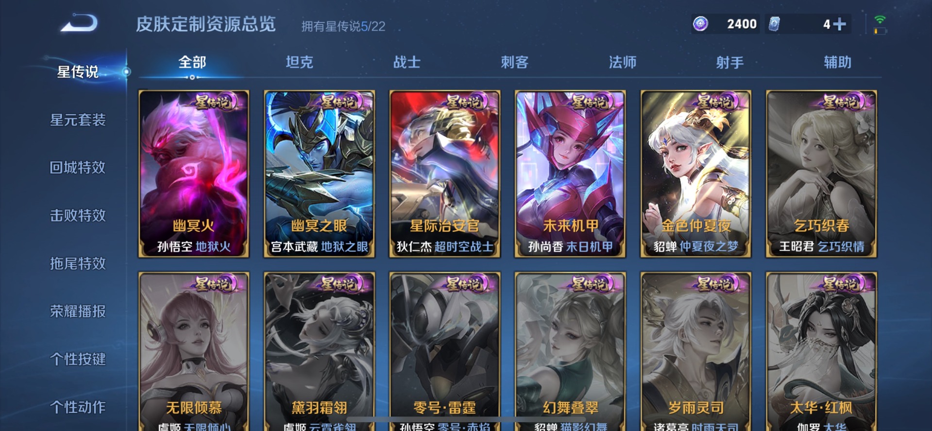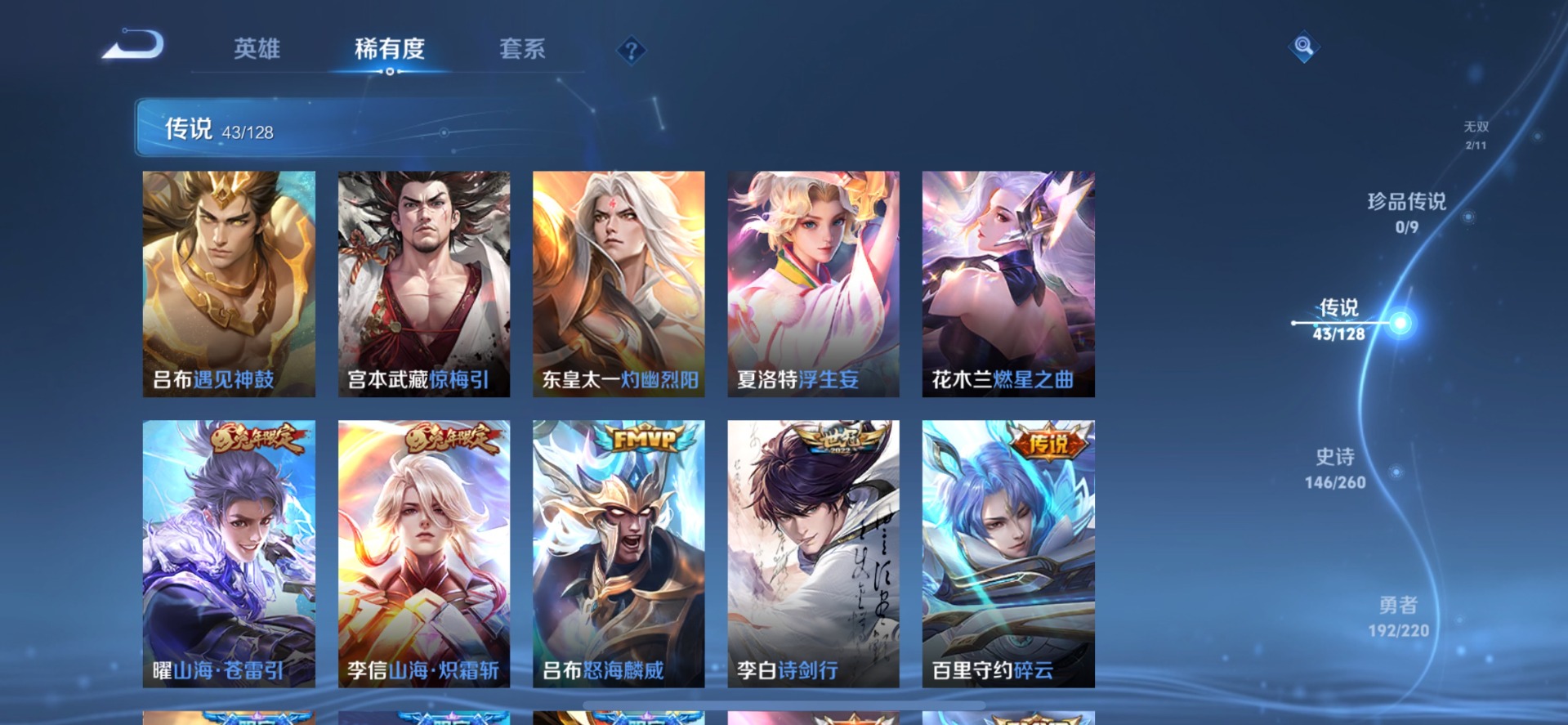 刘邦夺宝奇兵,夏侯惇朔风刀,老夫子醍醐杖,沈梦溪星空之诺,沈梦溪大漠名商,盾山御銮,曹操烛龙,孙膑妖精王,苏烈千军破阵,典韦穷奇,典韦蓝屏警告,达摩沙漠行僧,牛魔御旌,项羽苍威无极,鲁班七号狮舞东方,吕布猎兽之王,镜青焰无极,庄周蜃楼王,兰陵王金庭之子,裴擒虎擒涛扼浪,鲁班大师探海日志,明世隐疑决卦,蒙犽狂想玩偶喵,马可波罗暗影游猎,白起狰,鬼谷子原初探秘者,张良古海寻踪,女娲朔望之晖,桑启海盐诗旅,狄仁杰万华元夜,嬴政白昼王子,芈月重明,程咬金演武夺筹,扁鹊炼金王,李元芳云中旅人,弈星混沌棋,虞姬凯尔特女王,米莱狄御霄,钟馗驱傩正仪,狂铁御狮,太乙真人饕餮
