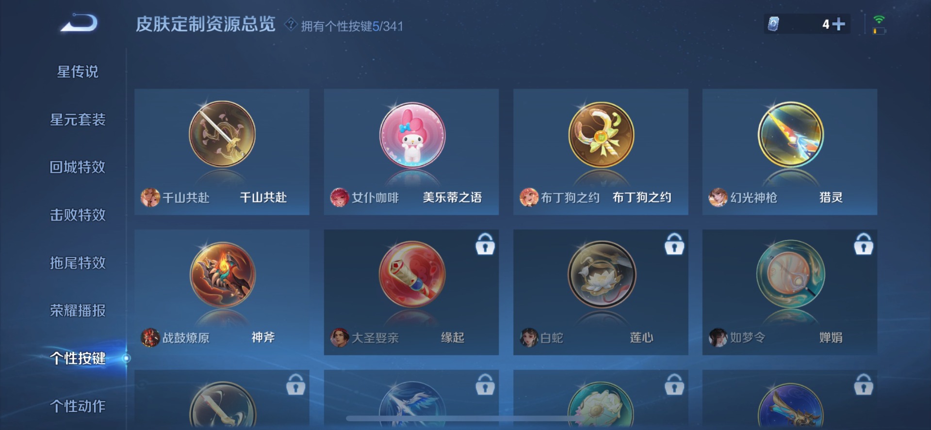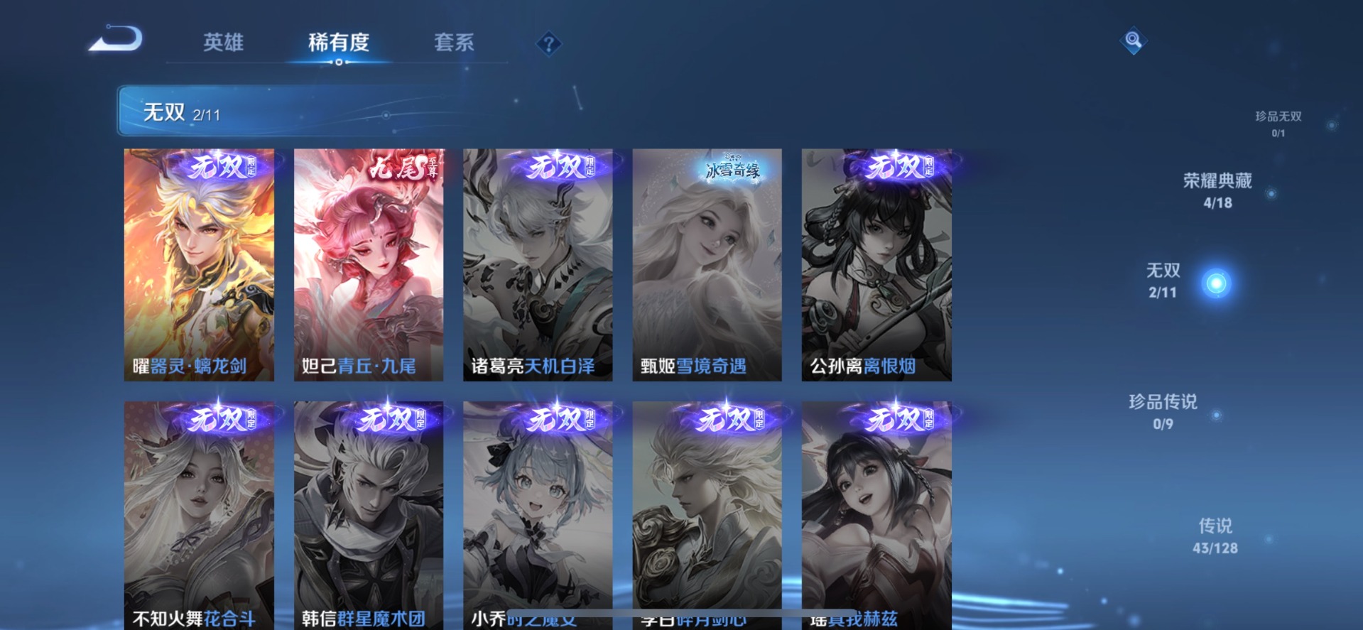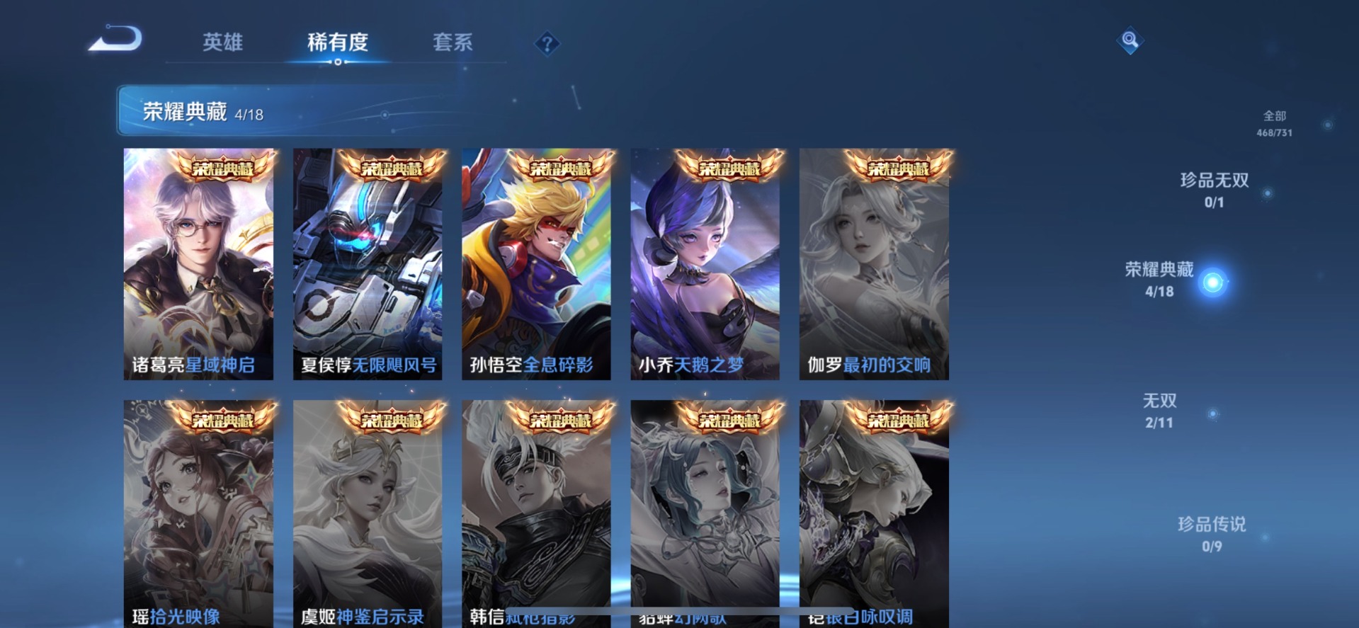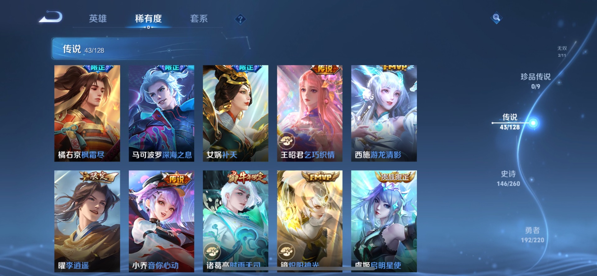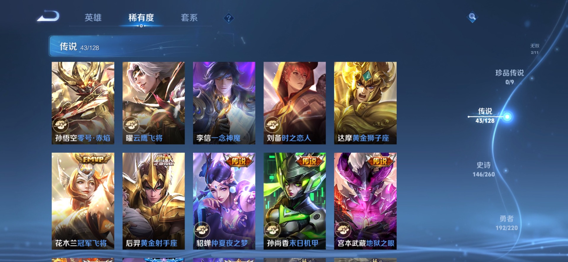 刘备时之恋人,铠琥珀纪元,典韦战鼓燎原,小乔音你心动,李信一念神魔,达摩黄金狮子座,王昭君乞巧织情,露娜霜月吟,吕布遇见神鼓,镜炽阳神光,宫本武藏惊梅引,夏洛特浮生妄,艾琳觅芳踪,西施游龙清影,孙悟空零号·赤焰,曜云鹰飞将,曜李逍遥,百里守约碎云,墨子黄金天蝎座,澜逐花归海,云缨幻光神枪