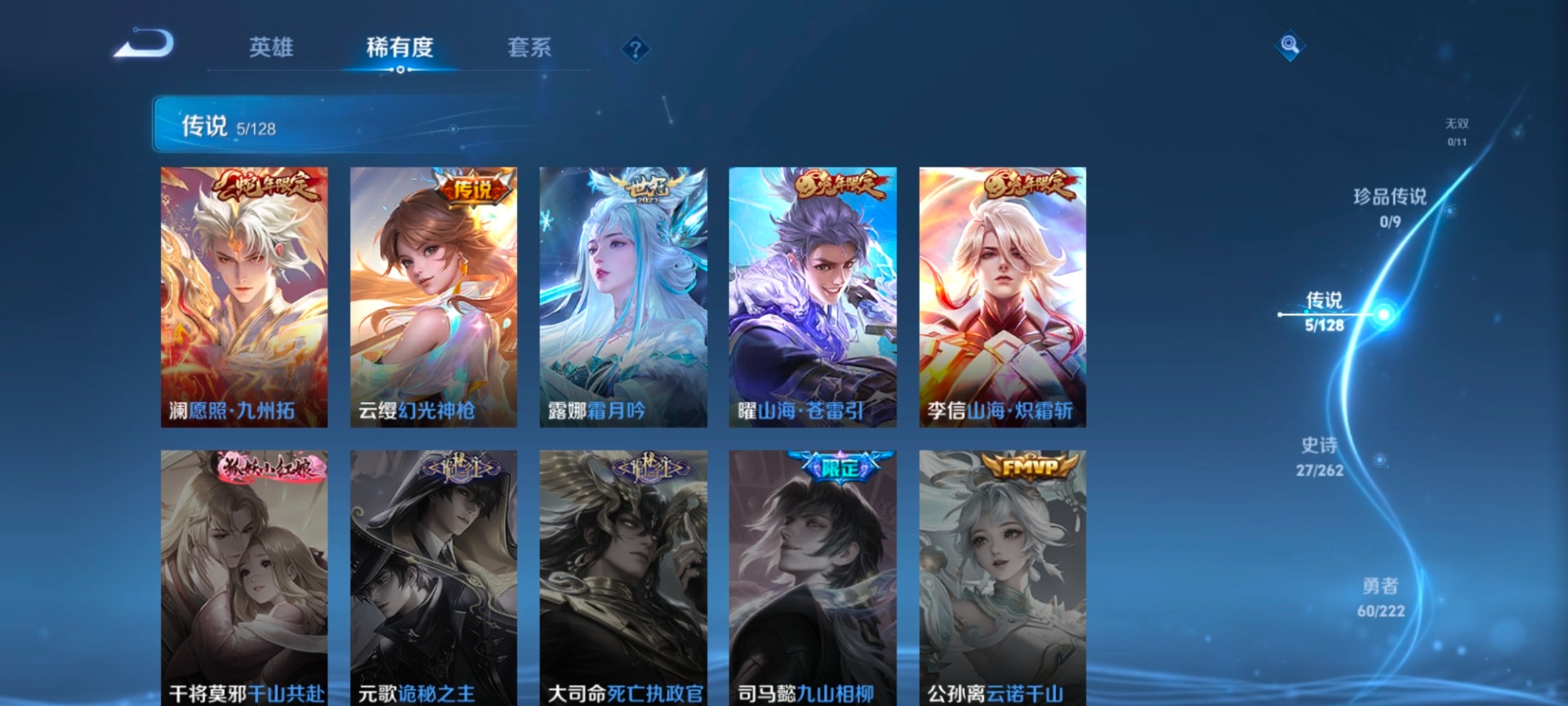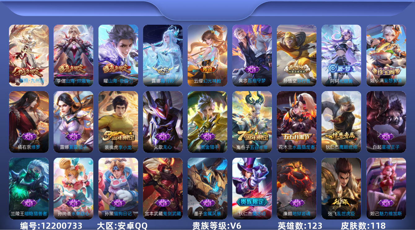[12200733]V6 5传说 123英雄 118皮肤 可修改实名 优质装备:山海·炽霜斩(李信年限),山海·苍雷引(电光曜子),霜月吟 传说皮:幻光神枪 珍宝阁皮:妄想食味 限定皮:愿照·九州拓(澜年限),逐霄战戟,五谷丰年,李小龙,孙行者 史诗皮:化蝶舞,百相守梦-黄忠,紫霞仙子,冰冠公主,偶像歌手,猫狗日记-孙策,乱世虎臣,修罗,摇滚巨星,水果甜心,绅士熊喵,星夜王子,暗隐猎兽者,鬼剑武藏,地狱岩魂,水晶猎龙者,金属风暴,鹰眼统帅,魅力维加斯,赏金猎手,无心