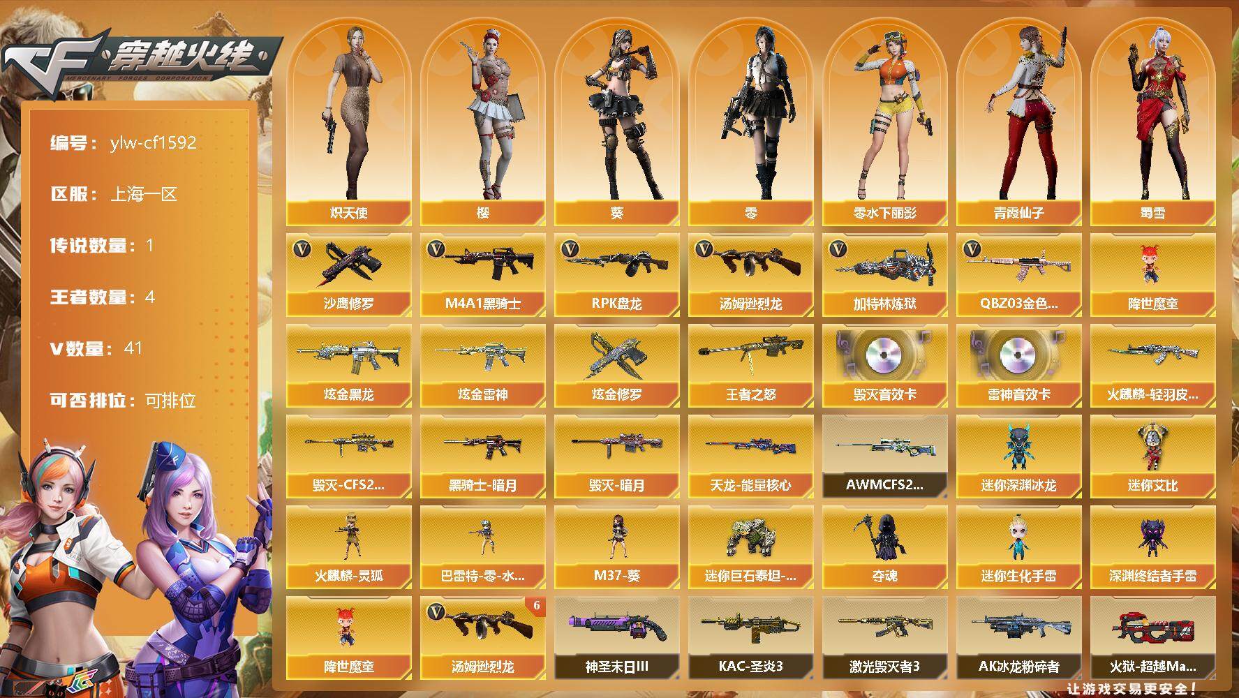 [12200782]【商品标题】:上海一区-41V-4王者-3炫金 【热门武器】:QBZ03-金色蔷薇,M4A1-黑骑士,汤姆逊-烈龙*6,RPK-盘龙,加特林-炼狱,降世魔童,沙鹰-修罗*4 【王者炫金武器】:炫金黑龙,炫金雷神,炫金修罗,王者之怒 【音效卡】:M4A1-雷神音效卡,Barrett-毁灭音效卡 【稀有皮肤】:火麒麟-轻羽皮肤,黑骑士-暗月,毁灭-暗月,毁灭-CFS2020,天龙-能量核心,AWM-CFS 2020 【角色】:零-水下丽影,零,葵,樱,蜀雪,炽天使,铁骑荣耀,青霞仙子 【人偶武器】:降世魔童,火麒麟-灵狐,巴雷特-零-水下丽影,M37-葵,迷你深渊冰龙,迷你艾比,迷你巨石泰坦-魔花研究所,夺魂*2,迷你生化手雷,深渊终结者手雷 【挑战大师】:神圣爆裂者-末日III,KAC-圣炎切割者III,阐释者III,激光毁灭者III,AK47-冰龙粉碎者,火狱乱世-超越Max 【英雄级武器】:M4A1-武圣,QBZ03-金色蔷薇,M4A1-雷神,M4A1-玫瑰精灵,M4A1-黑骑士,RPK-盘龙,加特林-炼狱,汤姆逊-烈龙*6,AK47-火麒麟,AN94-超新星,AWM-天龙*2,Barrett-毁灭,Barrett-极光,AWM-裁决,AK47-黑鲨,黑骑士-海王,AK-47-猩红传说,沙鹰-天神,沙鹰-修罗*4,麒麟刺,擎天,龙啸,屠龙*2 【特殊枪械】,1黑骑士,6烈龙,1盘龙,1炼狱,