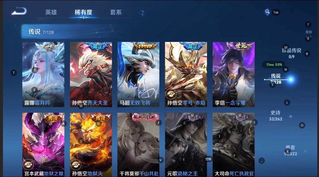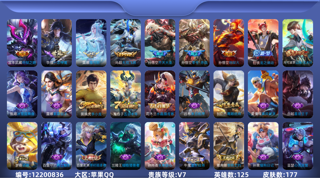 - [12081894]V7 1典藏 1珍品传说 7传说 125英雄 215皮肤 可修改实名 优质装备:最初的交响(伽罗典藏),怪盗基德,炽阳神光,末日机甲-孙尚香(绿蚂蚱),超时空战士-狄仁杰,无双飞将,云中君群星魔术团 珍宝阁皮:蔷薇恋人 限定皮:愿照·岁时盈(虞姬年限),逐霄战戟,高山流水,祈雪灵祝(雪兔子),李小龙,霸王别姬-虞姬 史诗皮:鸭鸭历险记-刘禅,器灵·浮梦炉,化蝶舞,星界战将,龙之律动,茶境仙,怒海争锋,埋骨钱,芈月浮光幕影,上官婉儿群星魔术团,蔬乡物语(鲁班七号),百相守梦-百里守约,紫霞仙子,黄金分割率,千年之狐,江河有灵,末日机甲-莱西奥,青蛇,偶像歌手,电玩·爆裂旋风,末日机甲-吕布,猫狗日记-孙策,时之恋人-孙尚香,乱世虎臣,节奏热浪,修罗,女仆咖啡,水果甜心,绅士熊喵,星夜王子,暗隐猎兽者,幽灵船长,鬼剑武藏,天秀·启明,纤云弄巧,乘风破浪,逐浪之夏,水晶猎龙者,曙光守护者,箭羽风息,原初追逐者,圣诞狂欢,鹰眼统帅,暗夜贵公子,魅力维加斯,奇遇舞章,无心