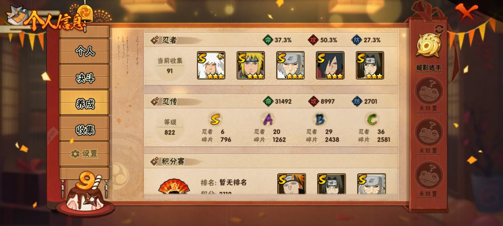 [12200911]V7 6S忍 20A忍 13通灵 462.3W战力 可二次 可修改实名 优质装备:千手扉间「秽土转生」,宇智波斑「秽土转生·解」 S级忍者:自来也 「舞之豪杰」,宇智波鼬 「须佐能乎」,佩恩「天道」,波风水门