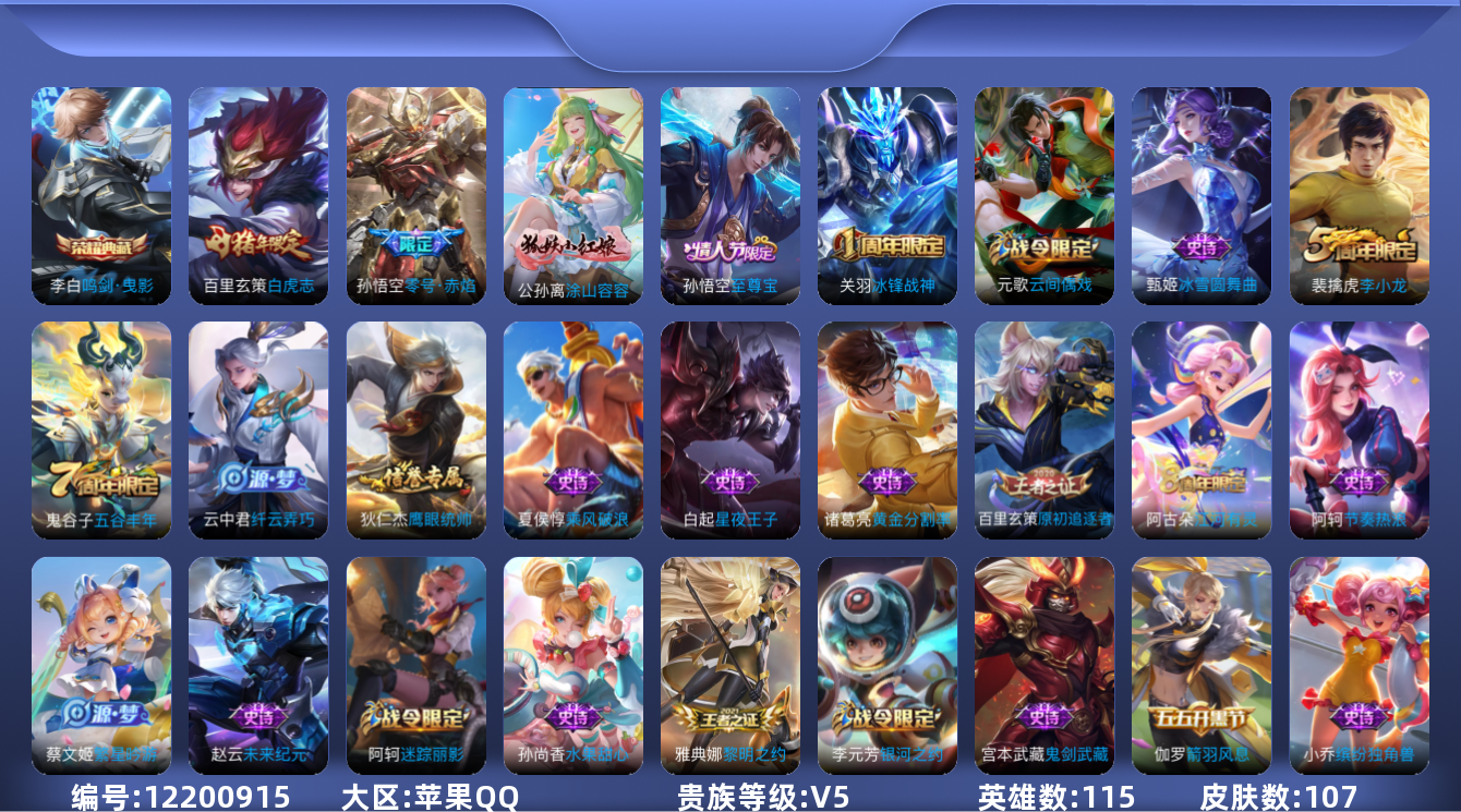 [12200915]V5 1典藏 2传说 115英雄 107皮肤 可修改实名 优质装备:鸣剑·曳影,零号·赤焰,涂山容容 珍宝阁皮:女武神 限定皮:至尊宝,白虎志(电光耗子),五谷丰年,冰锋战神,李小龙 史诗皮:黄金分割率,江河有灵,乱世虎臣,节奏热浪,水果甜心,星夜王子,功夫厨神,德古拉伯爵,鬼剑武藏,纤云弄巧,繁星吟游(呼啦呼啦),缤纷独角兽,乘风破浪,箭羽风息,原初追逐者,鹰眼统帅,黎明之约,未来纪元-赵云