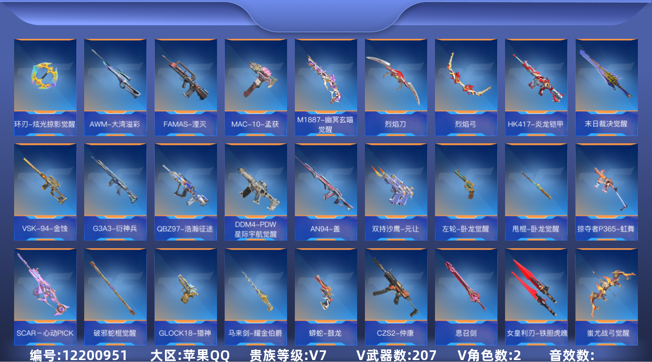 [12200951]可二次 可修改实名 V7 3王者武器 207英雄武器 2英雄角色 351万化 大师S 武器:王者之影,王者之力,AK47-奉先,M4A1-星象,M4A1-仲达,M200-幻神,TAC-慈,MR1-龙吟惊沧海,激昂霸王枪,KSG-孟获,MK47-云舞,81式-光明之神,COP 357-堕天神,COP 357-雷霆,AK47-黑武士觉醒,AK47-火麒麟,AK47-木兰,AK47-无影,AK47-燎天净火,M4A1-游骑兵,M4A1-黑龙,M4A1-黑骑士,M4A1-死神,M4A1-雷神,M4A1-竞界荣光,M4A1-堕天神,巴雷特-金色蔷薇,巴雷特-极光,巴雷特-毁灭,AWM-天使,QBZ19-天使,G36-竞技战魂,QBZ03-金色蔷薇,QBZ03-死神,9A91-游骑兵,AUG-机械纪元,双持斯泰尔-天使,AK47-黑鲨,AK47-猩红传说,AK47-血武士,M4A1-龙血,M4A1-玫瑰精灵,M4A1-樱龙·一觉,M4A1-心动次元觉醒,M4A1-破空冰刃,M4A1-猎神,M4A1-海骑士,98K-星神,AWM-裁决,SCAR-幽暗骑士,09式狙-天神,暗杀神,M200-心动次元,09式狙-魔音长歌觉醒,AK12-天启,M14EBR-天神,剑齿虎-炫彩,SCAR-探星者,9A91-天神,AK47-破空冰刃,CBJ-MS-毒蜂,地狱火,AA12-火药,CZS2-心动次元,地狱烈炎,A180-地狱凤凰,寒霜烈龙,黑龙魂,加特林-堡垒,KSG-极光,MK47-鼓龙,M4A1-神工天巧,QBZ03-玉面羞花,M14EBR-拂影,SCAR-印刷术觉醒,SCAR-印刷术,AK47-雅韵青花,M4A1-太白诗仙,HK416-极光,9A91-魔蜥觉醒,AN94-赳赳秦师,方天画戟,虎贲钩镰刀,沙鹰-修罗,沙鹰-神兵修罗,沙鹰-宇航兔兔,M16-恶魔,手斧-机械迷城,尼泊尔-冰锋觉醒,擎天,百战巾帼枪,马来剑-毁灭,USP-太白诗仙,蚩尤战弓觉醒,M4A1-铁胆虎魄,龙啸-堕天神,MK47-塔罗牌觉醒,沙鹰-天神,丛林匕首-庆龙觉醒,迷你玉凝,麒麟刺,血月,屠龙,秋逸,唐刀-大唐荣耀,神罚战斧,太白诗仙扇,蝴蝶刀-天神,女皇利刃-铁胆虎魄,闪光弹-天使,烟雾弹-天使,烟雾弹-雷暴,高爆手雷-雷霆,黑骑士闪光弹,黑骑士烟雾弹,黑武士手雷,火麒麟手雷,火麒麟闪光弹,闪光弹-游骑兵