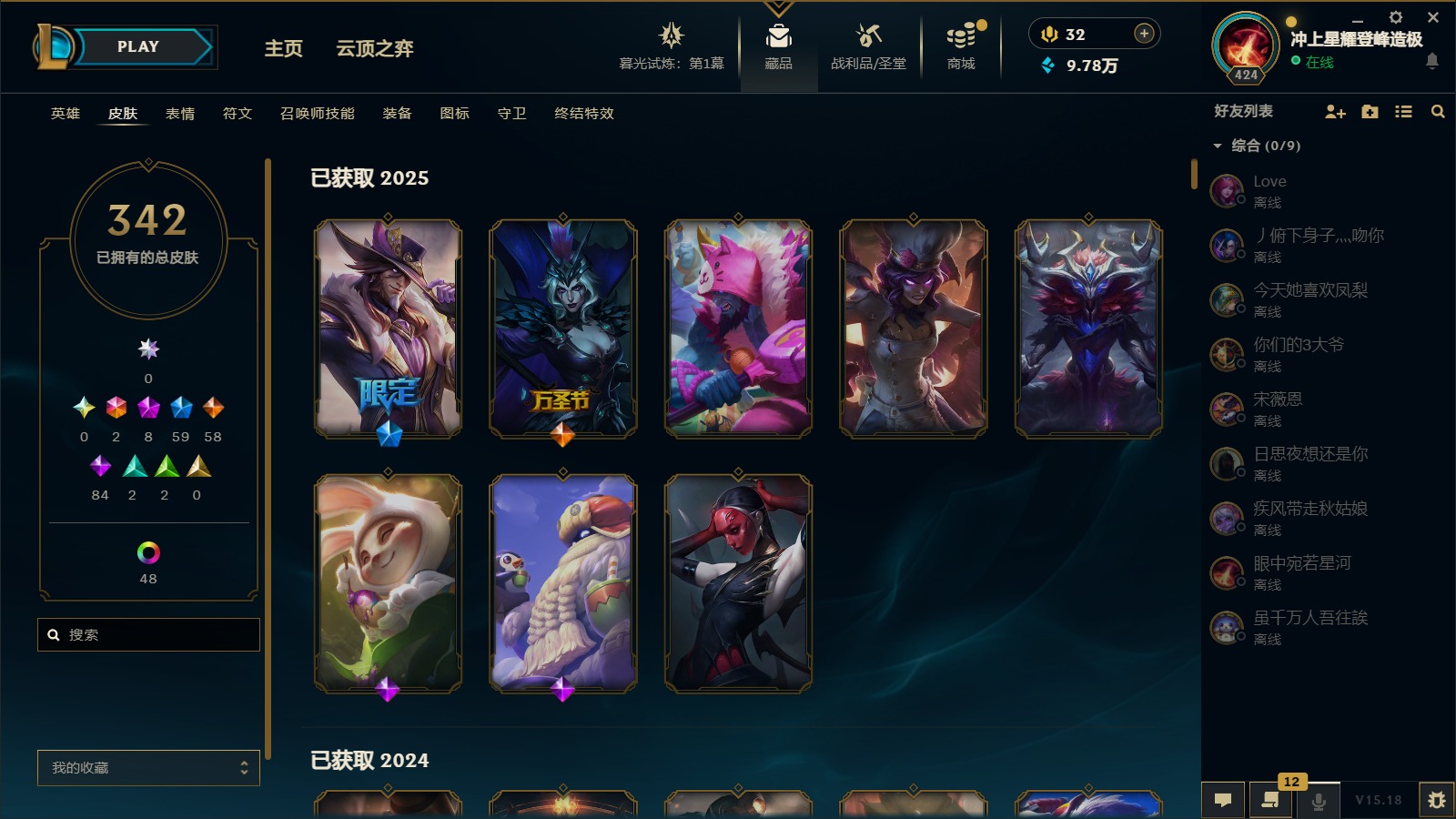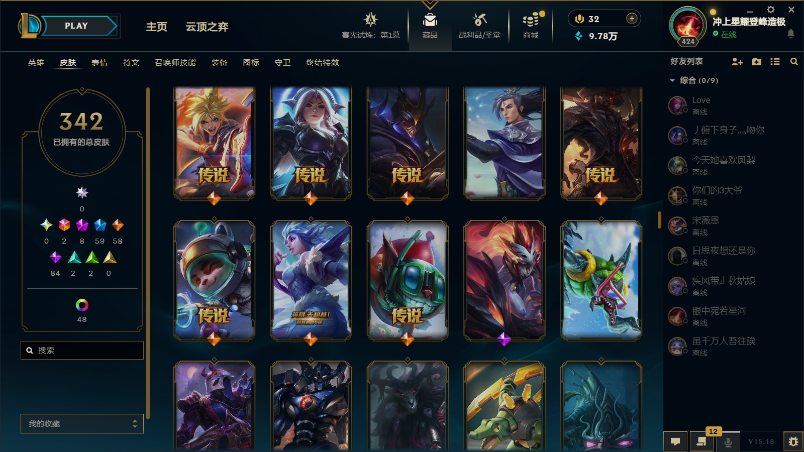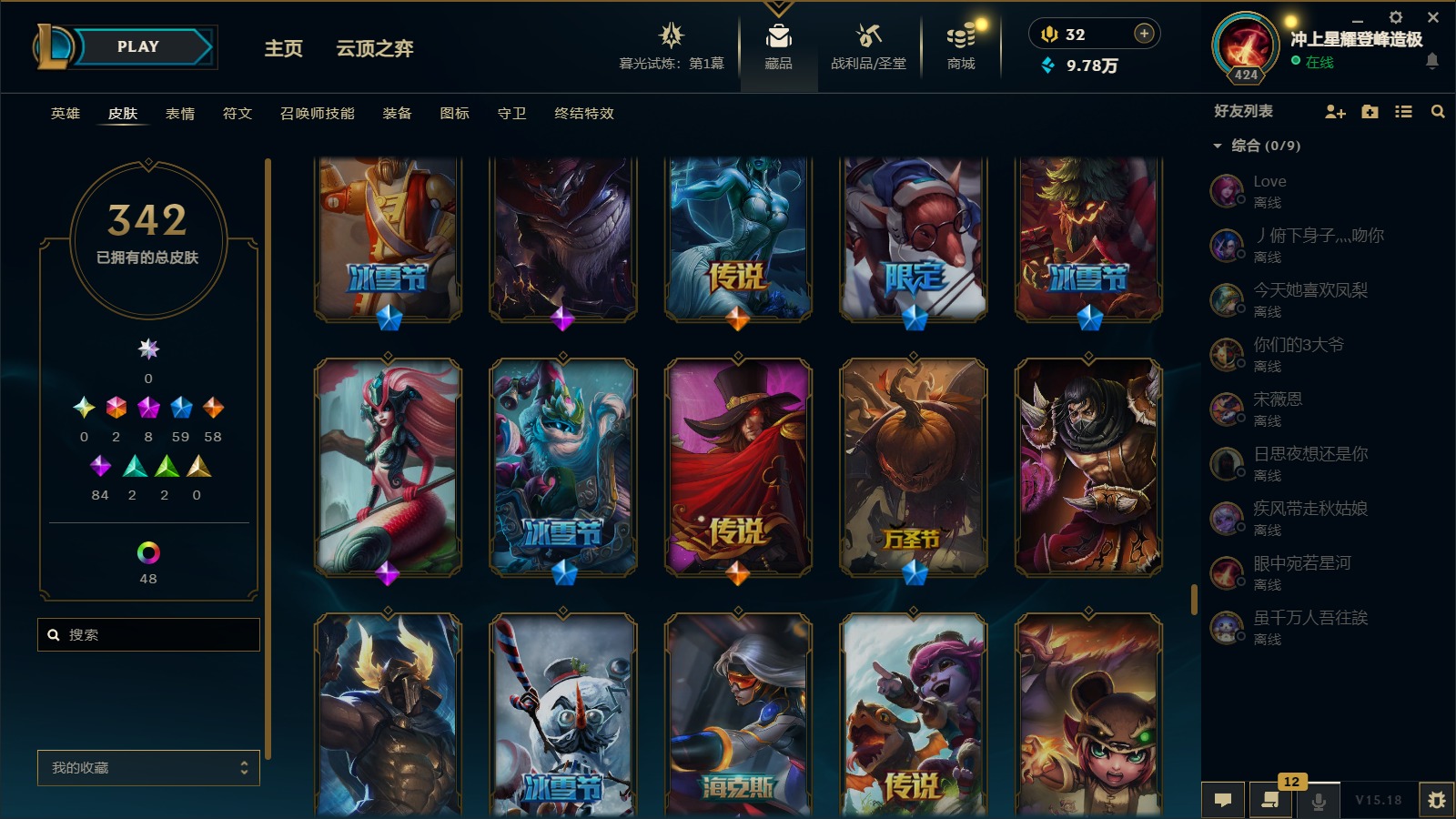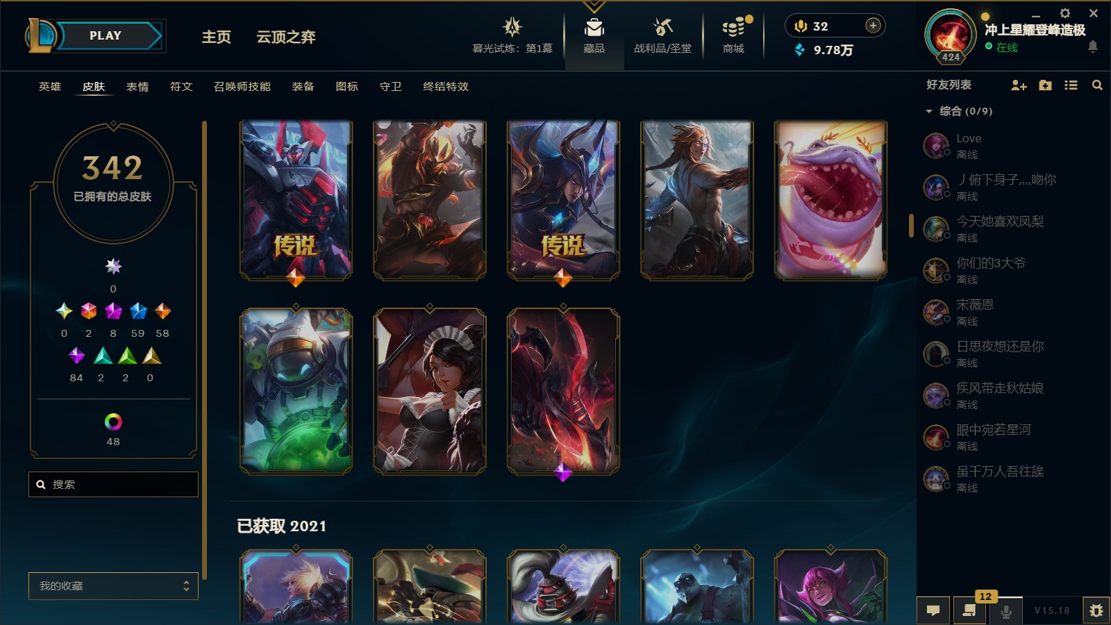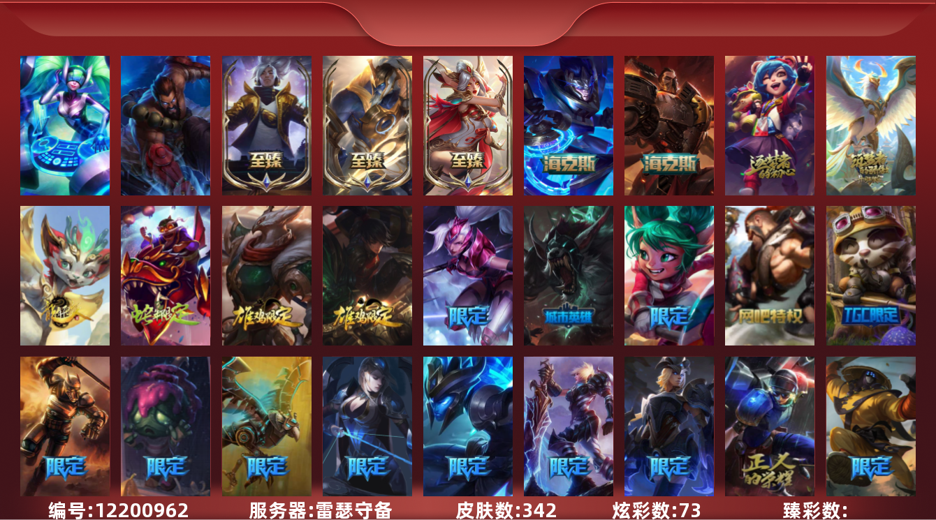 [12200962]2终极 8神话 59限定 58传说 84史诗 342皮肤 73炫彩 171英雄 可二次 可修改实名 优质装备:至臻 飞升战神 潘森,至臻 真实伤害 亚索,防爆天使 凯尔,暗影 沃里克,巧克力工坊 波比,钢铁之翼 凤凰,冠军之箭 艾希,冠军之矛 滑板鞋,冠军之刃 锐雯,冠军之血 希瓦娜,惊悚派对 阿木木,警用试作体K-9 内瑟斯,密林猎手 提莫,野兽猎人 德莱文,勇者 奈德丽,至臻 神凰行者 烈羽焰凰 霞,灵魂守卫,DJ-娑娜,卧虎藏龙 贾克斯,冠军之血 希瓦娜 凯旋圣装,净雪之月 莫甘娜 冬虹,魔女 阿卡丽 虚荣 海克斯:海克斯 嘉文四世,恐惧新星 德莱厄斯 限定:玉剑传说 翼剑仙,钢铁军团 拉克丝 情人节限定:觅心女王 寒冰 赛季限定皮:胜利之运 崔斯特,胜利巨口 克格莫,胜利之王 泰达米尔 冠军限定系列:S1FNC 酒桶,S1FNC 迦娜,S2 暗杀星 发条,S2 暗杀星 蒙多,S4 SSW 锤石,S4 SSW 泰隆,S4 SSW 图奇,S4 SSW 炼金,S5 SKT T1 滑板鞋 冰雪节限定:“主人不要我了” 阿木木,冰雪节 炼金,冰雪女神 辛德拉,冰雪兽 纳尔,寒冬精灵 璐璐,胡桃夹子 小丑,魄罗骑士 瑟庄妮,圣诞开心鬼 提莫,圣诞精灵 崔丝塔娜,圣诞狂欢 努努,圣诞老人 布隆,圣诞糖果棒 厄运小姐,圣诞玩偶 波比,冰雪节 茂凯,邪恶圣诞老人 维迦,幸福女神 乐芙兰,雪默丁格,英勇玩具兵船长 泳池派对:泳池派对 吉格斯,泳池派对 蕾欧娜,泳池派对 男枪,泳池派对 厄运小姐,泳池派对 雷克顿 万圣节限定:鬼影森森 茂凯,鬼影重重 魔腾,南瓜头 费德提克,死亡誓约 卡特琳娜 年限:天龙之子 斯莫德,蛇年 库奇,鸡年 阿兹尔,鸡年 蔚 周年:10周年 安妮,10周年 凤凰