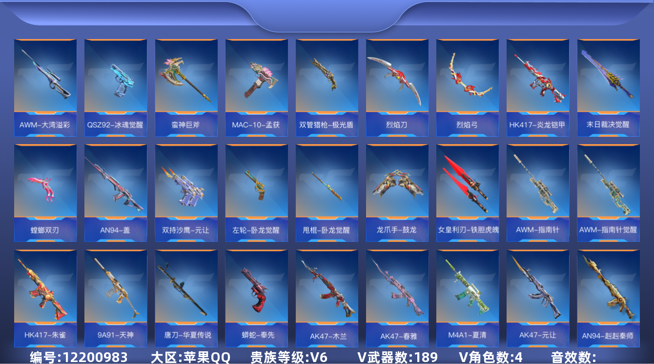[12200983]可二次 可修改实名 V6 3王者武器 189英雄武器 4英雄角色 420万化 大师 武器:王者之神,M12S-雷霆王者,M200-幻神,MR1-龙吟惊沧海,KSG-孟获,81式-光明之神,MK47-云舞,M4A1-冰锋觉醒,M4A1-堕天神,M4A1-机械迷城,巴雷特-金色蔷薇,巴雷特-极光,巴雷特-毁灭,AK47-黑武士觉醒,AK47-无影,AK47-变色龙,AK47-火麒麟,M4A1-死神,M4A1-黑骑士,AK47-木兰,M4A1-雷神,M4A1-雷神-萝拉,AUG-机械纪元,9A91-游骑兵,AWM-天使,QBB95-极光,双持斯泰尔-天使,MK5-极光,VEPR12-宙斯,M4A1-破空冰刃,M4A1-猎神,M4A1-赛博雷神,M4A1-心动次元,M4A1-海骑士,巴雷特-冬灭,巴雷特-枪娘,AK47-心动次元觉醒,AK47-樱斗士-一觉,AK47-幸运日觉醒,AK47-雷麒麟,AK47-亚龙,AK47-幸运日,AK47-沙漠郡主-一觉,M4A1-龙血,AK47-血武士,AK47-华夏传说,AK47-春雅,剑齿虎-炫彩,M14EBR-天神,9A91-天神,SCAR-幽暗骑士,SCAR-探星者,M4A1-夏清,M200-心动次元觉醒,09式狙-天神,AK47-元让,AK12-天启,M14EBR-拂影,SCAR-印刷术,汤姆逊-烈龙,寒霜烈龙,加特林-堡垒,加特林-堡垒觉醒,刘易斯-血月,AK47-破空冰刃,KSG-火力竞放觉醒,毁灭征服者-超越Max,AA12-火药,QBZ03-玉面羞花,MK47-鼓龙,CBJ-MS-毒蜂,地狱火,QCW05-变形金刚·大黄蜂,PP19野牛-造纸术觉醒,CZS2-血月,打击者-天神,地狱烈炎,CZS2-心动次元觉醒,地狱烈樱·一觉,AN94-赳赳秦师,M4A1-太白诗仙,沙鹰-孟德,双管猎枪-威侯,蟒蛇-奉先,柯尔特-仲达,双管猎枪-文远,方天画戟,虎头湛金枪,铁锹-孟德,虎贲钩镰刀,毛瑟-毒蜂,QSZ92-金色蔷薇,沙鹰-神兵修罗,改装GLOCK-木兰,沙鹰-修罗,沙鹰-幻兽,双持柯尔特-极光,M4A1-铁胆虎魄,马来剑-毁灭,尼泊尔-冰锋觉醒,擎天觉醒,双截棍-天使,USP-太白诗仙,龙啸-堕天神,尼泊尔-机械纪元,手斧-机械迷城,尼泊尔-铜头铁臂,蟒蛇-火力竞放,双持沙鹰-亚龙,麒麟刺,唐刀-大唐荣耀,星芒