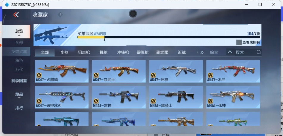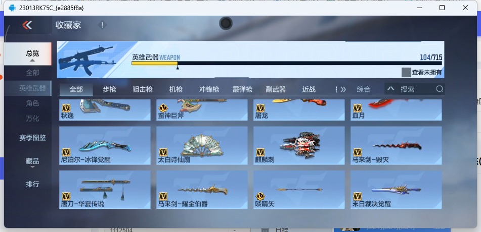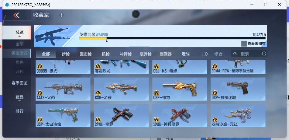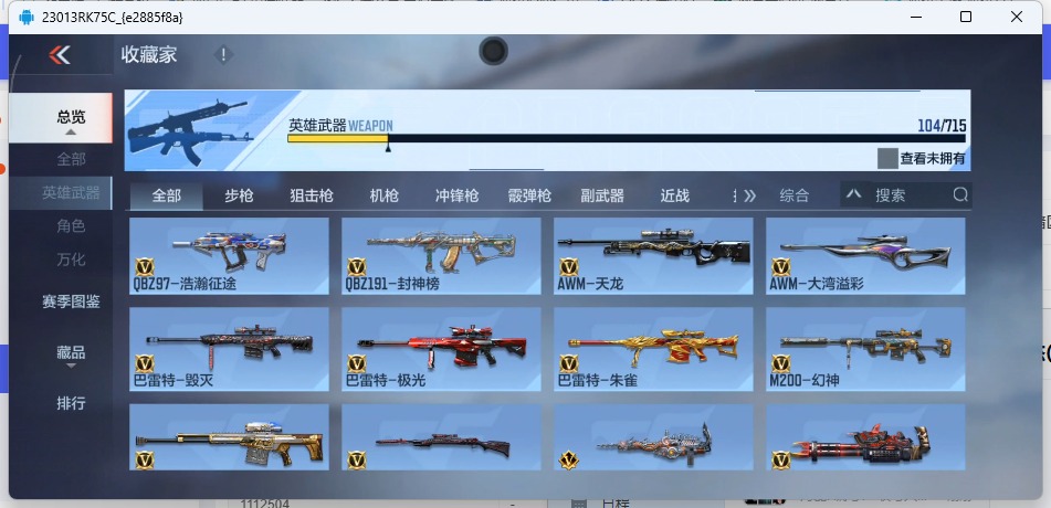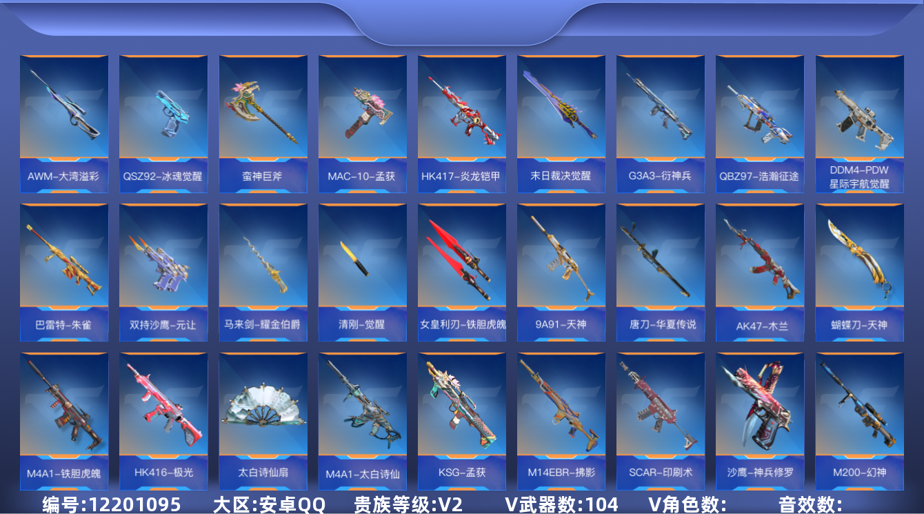 [12201095]可二次 可修改实名 V2 104英雄武器 138万化 专家S 武器:M200-幻神,MK47-云舞,81式-光明之神,KSG-孟获,AK47-死神,M4A1-死神,M4A1-雷神,M4A1-黑骑士,AK47-火麒麟,AK47-木兰,巴雷特-极光,巴雷特-毁灭,QBZ03-金色蔷薇,AK47-血武士,AK12-天启,9A91-天神,AWM-天龙,SCAR-印刷术,M14EBR-拂影,AK47-破空冰刃,AA12-火药,寒霜烈龙,M4A1-太白诗仙,HK416-极光,QSZ92-华夏传说,沙鹰-神兵修罗,沙鹰-修罗,USP-机械迷城,M4A1-铁胆虎魄,马来剑-毁灭,尼泊尔-冰锋觉醒,唐刀-华夏传说,麒麟刺,血月,屠龙,秋逸,太白诗仙扇,蝴蝶刀-天神,女皇利刃-铁胆虎魄,炽芒蝶刀,清刚-觉醒,巴雷特-朱雀,QBZ97-浩瀚征途,马来剑-耀金伯爵,双持沙鹰-元让,DDM4-PDW-星际宇航觉醒,G3A3-衍神兵,末日裁决觉醒,HK417-炎龙铠甲,MAC-10-孟获,QSZ92-冰魂觉醒,蛮神巨斧,AWM-大湾溢彩