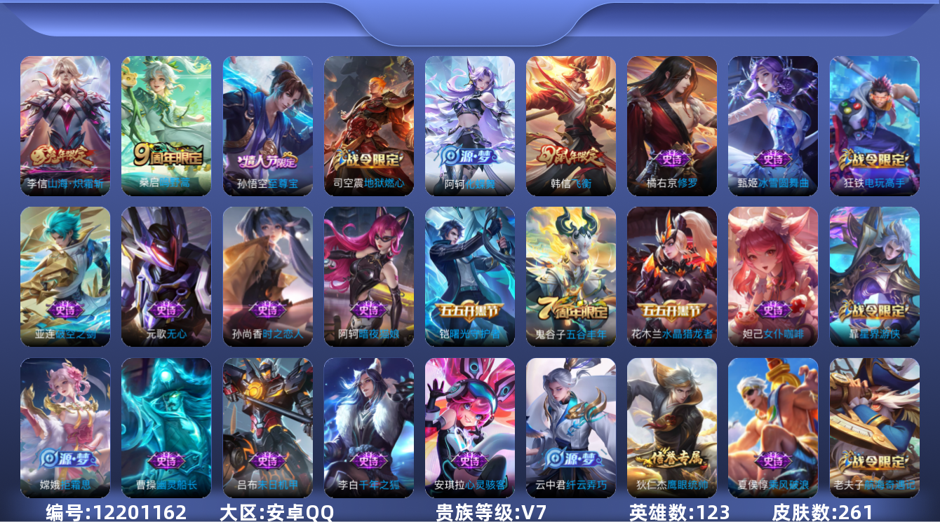 [12201162]V7 2传说 123英雄 261皮肤 可修改实名 优质装备:山海·炽霜斩(李信年限) 珍宝阁皮:优雅恋人,玩趣恶龙 限定皮:鸣野蒿,至尊宝,飞衡(韩信年限),高山流水,五谷丰年,梁祝 史诗皮:化蝶舞,破空之剑,苍穹之光,白龙吟,黄金分割率,特工魅影,千年之狐,江河有灵,百解令(蒙犽),蒙恬荣光圣徽,冰冠公主,偶像歌手,暗夜猫娘,末日机甲-吕布,猫狗日记-孙策,时之恋人-孙尚香,乱世虎臣,修罗,女仆咖啡,摇滚巨星,水果甜心,天才门将,星夜王子,心灵骇客,功夫厨神,德古拉伯爵,暗隐猎兽者,幽灵船长,鬼剑武藏,心灵战警,地狱岩魂,纤云弄巧,拒霜思,缤纷独角兽,乘风破浪,逐浪之夏,水晶猎龙者,曙光守护者,箭羽风息,金属风暴,原初追逐者,圣诞狂欢,圣诞恋歌,鹰眼统帅,魅力维加斯,黎明之约,无心,未来纪元-赵云