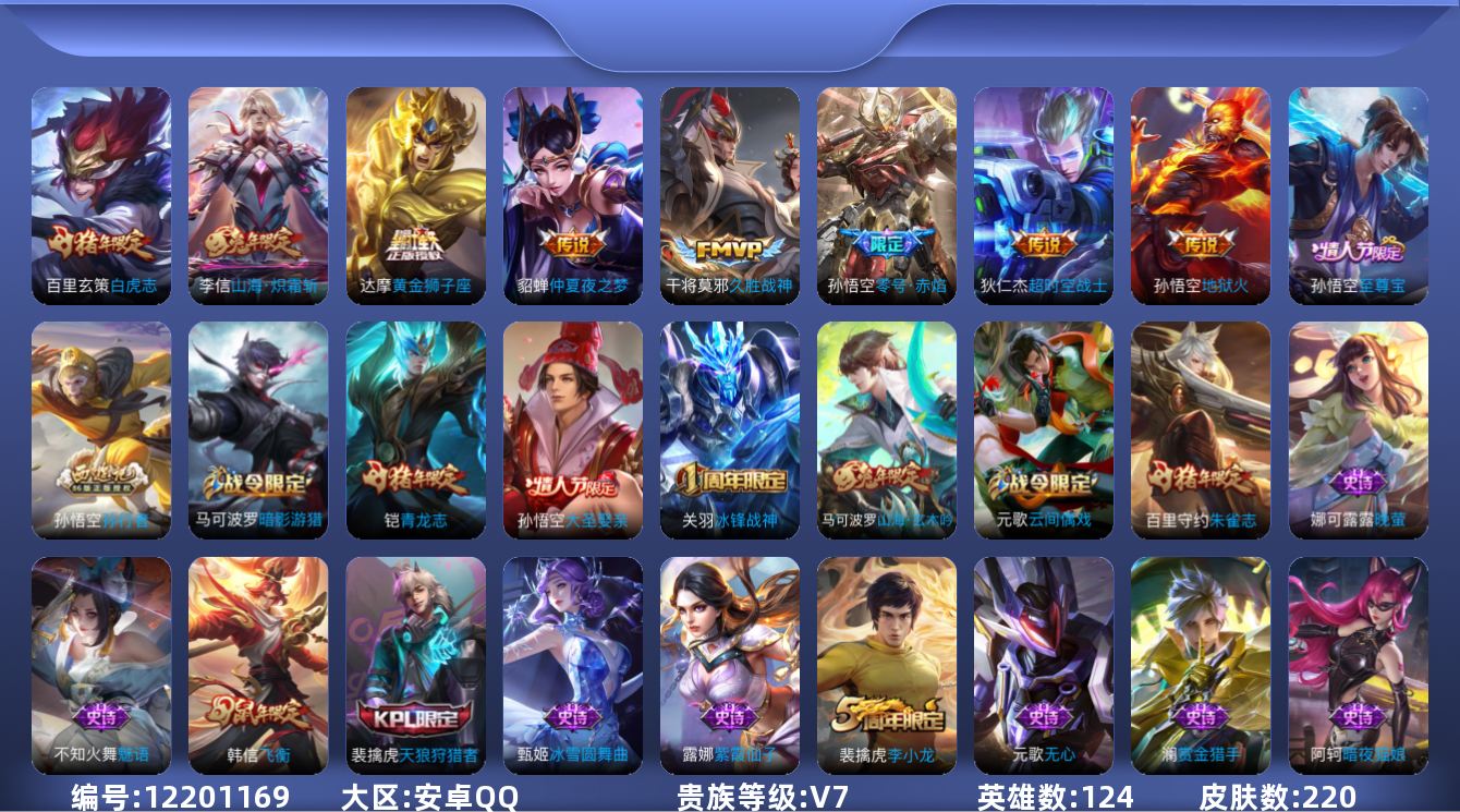 [12201169]V7 8传说 124英雄 220皮肤 可修改实名 优质装备:黄金狮子座,久胜战神,地狱火,仲夏夜之梦(大飞蛾),零号·赤焰,超时空战士-狄仁杰,山海·炽霜斩(李信年限) 珍宝阁皮:蔷薇恋人 限定皮:至尊宝,白虎志(电光耗子),飞衡(韩信年限),瑞麟志(木兰年限),遇见飞天,五谷丰年,青龙志(铠年限),冰锋战神,游园惊梦,天狼狩猎者,逐梦之星,李小龙,朱雀志(守约年限),孙行者,大圣娶亲,山海·玄木吟(马可年限) 史诗皮:紫霞仙子,苍穹之光,白龙吟,黄金分割率,千年之狐,魅语,偶像歌手,晚萤,暗夜猫娘,乱世虎臣,节奏热浪,摇滚巨星,水果甜心,绅士熊喵,星夜王子,功夫厨神,德古拉伯爵,暗隐猎兽者,鬼剑武藏,地狱岩魂,纤云弄巧,繁星吟游(呼啦呼啦),拒霜思,缤纷独角兽,乘风破浪,逐浪之夏,水晶猎龙者,曙光守护者,金属风暴,原初追逐者,圣诞恋歌,鹰眼统帅,王者之锤,魅力维加斯,黎明之约,赏金猎手,无心,未来纪元-赵云