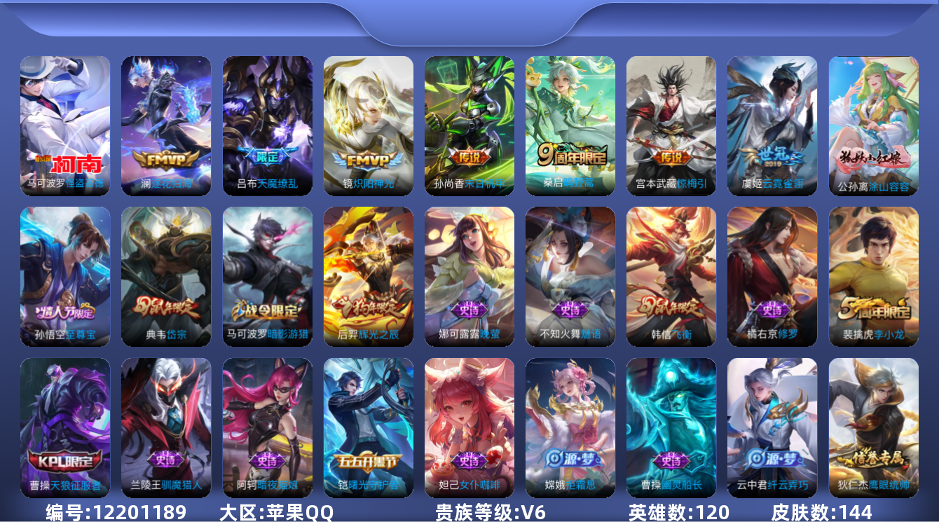 [12201189]V6 1珍品传说 7传说 120英雄 144皮肤 可修改实名 优质装备:怪盗基德,炽阳神光,云霓雀翎,末日机甲-孙尚香(绿蚂蚱),惊梅引,澜逐花归海,涂山容容 珍宝阁皮:胡桃夹子 限定皮:鸣野蒿,至尊宝,飞衡(韩信年限),岱宗(典韦年限),天狼征服者,李小龙,辉光之辰,天魔缭乱 史诗皮:星界战将,蒙犽顽岩魄,特工魅影,江河有灵,百解令(蒙犽),魅语,晚萤,偶像歌手,暗夜猫娘,猫狗日记-孙策,乱世虎臣,修罗,女仆咖啡,水果甜心,星夜王子,幽灵船长,鬼剑武藏,纤云弄巧,拒霜思,乘风破浪,逐浪之夏,曙光守护者,箭羽风息,金属风暴,圣诞恋歌,鹰眼统帅,魅力维加斯