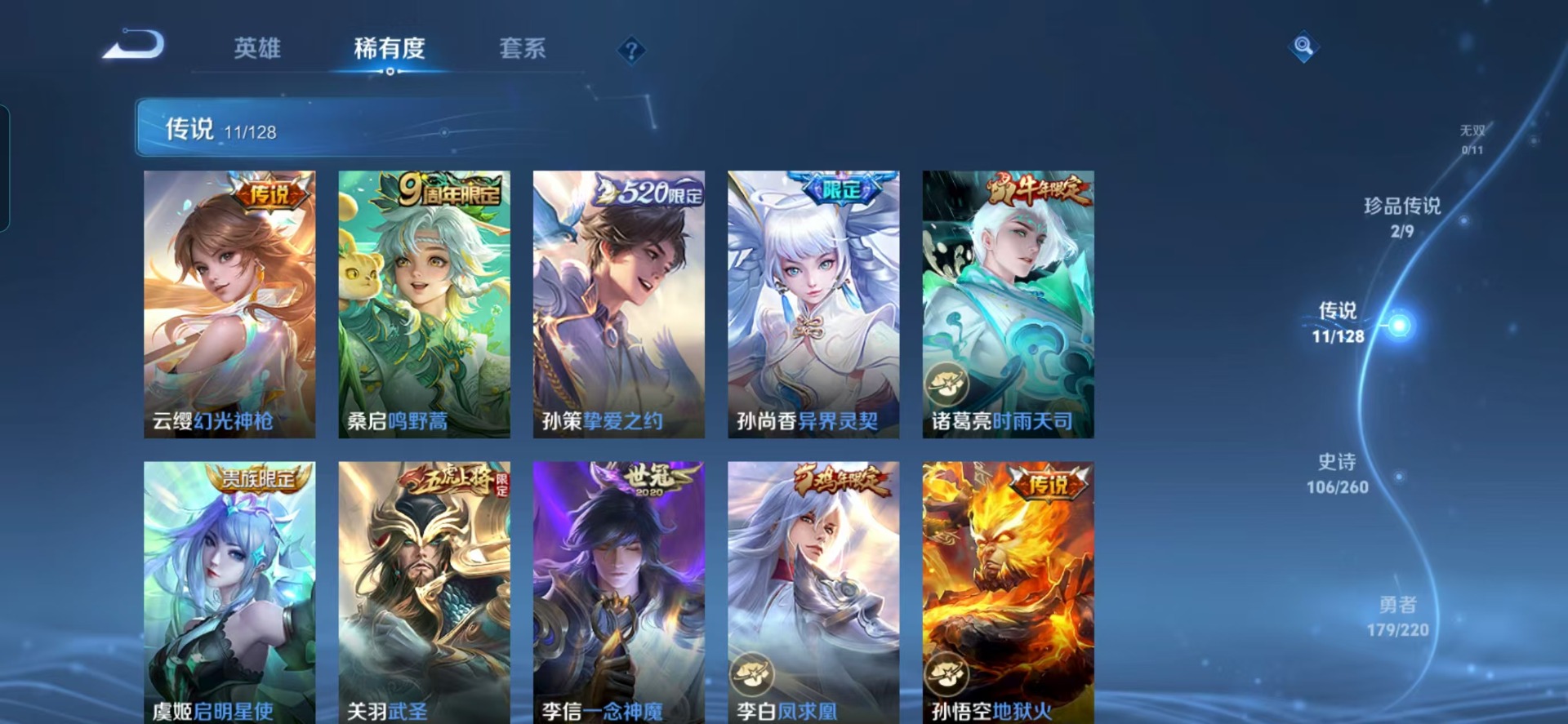 - [12088976]V6 3传说 122英雄 138皮肤 可修改实名 优质装备:末日机甲-孙尚香(绿蚂蚱),地狱火 传说皮:云诺千山 珍宝阁皮:玩趣恶龙 限定皮:五谷丰年,李小龙,孙行者 史诗皮:苍穹之光,白龙吟,特工魅影,时之恋人-孙尚香,女仆咖啡,水果甜心,星夜王子,功夫厨神,德古拉伯爵,暗隐猎兽者,幽灵船长,鬼剑武藏,乘风破浪,逐浪之夏,水晶猎龙者,箭羽风息,金属风暴,原初追逐者,鹰眼统帅,魅力维加斯,未来纪元-赵云