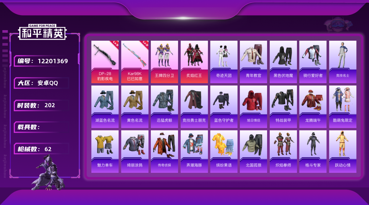 [12201369]2粉装 2特效枪 可二次 可修改实名 优质装备:炙焰红王,王牌四分卫,Kar98K-巳巳如意 热门装扮:奇迹天团 稀有枪皮:DP-28-豹影疾电 五级特效枪:五级Kar98K-巳巳如意,五级DP-28-豹影疾电 紫色装扮:SS33特训套装,旭日情侣,北国孤狼,夏日音浪,时希公主,治愈之星,科技之星,SS14特训,萌趣颜团子,潮流游乐家,骑行爱好者,魅力单车,鹤鸣,黄色名流,黑色伏地魔,龙腾端午,青年教官,迅猛虎鲸,酷萌兔限定,跃动心情,湖蓝色名流,牛气冲天,牛气满满,特战装甲,绮丽涂鸦,缤纷果语,蓝色守护者,王牌教练,竞技勇士朋克,福星高照,巳巳如意,智谋强哥,竞技名士,SS8特训,SS9特训,炽焰拳师,格斗专家,SS12特训,韶华初心,骁骑迪迦,诡谋托雷基亚,耀粉歌者,弄潮海豚,传奇侦探 优质战备:飞行器-终极赛罗,银刃赛罗降落伞