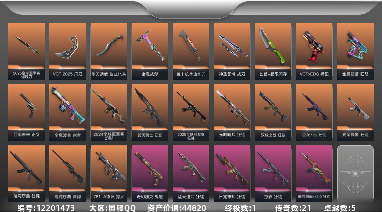 [12201473]21橙皮 1金皮 5紫皮 84皮肤 27英雄 106卡面 1085已用源晶 超凡 优质装备:2025全球冠军赛 蝴蝶刀,幻影-2024全球冠军赛,狂徒-混沌序曲,冥驹-混沌序曲,狂徒-光明哨兵,狂徒-掠影,獠犬-781-A协议,狂徒-日冕雄师,幻影-毁灭骑士,判官-全息波普,堕天遗武 仪式匕首,鬼魅-奇幻朋克,全息战斧,匕首-超限闪存,荒土机兵热能刀,神圣领域 战刀,VCT 2025 爪刀,2025全球冠军赛 狂徒 套装:VCT 2025赛季礼包,VCTCN2025套装 佩枪皮肤:正义-西部未来,狂怒-全息波普,标配-VCTxEDG 步枪皮肤:狂徒-创·纪元,狂徒-双城之战,狂徒-般若假面//2.0,狂徒-光荣异象,狂徒-堕天遗武