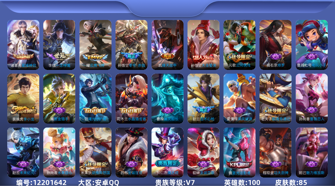 [12201642]V7 1典藏 4传说 100英雄 85皮肤 可修改实名 优质装备:星域神启(倪克斯贼亮),云鹰飞将(小将军),绛天战甲(鸡嘴战神),一念神魔,零号·赤焰 珍宝阁皮:蔷薇恋人 限定皮:李小龙,大圣娶亲,匿光追影者,百木心枪 史诗皮:电玩小子(小书包),偶像歌手,修罗,水果甜心,功夫厨神,幽灵船长,乘风破浪,水晶猎龙者,曙光守护者,圣诞狂欢,圣诞恋歌,魅力维加斯,赏金猎手,未来纪元-赵云
