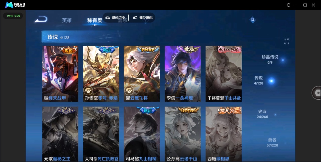 - [11657914]V7 1典藏 5传说 124英雄 162皮肤 可修改实名 优质装备:鸣剑·曳影,地狱火,超时空战士-狄仁杰,鹤羽星尊,玄雷天君 珍宝阁皮:蔷薇恋人 限定皮:五谷丰年,武圣,梁祝,李小龙,猪悟能 史诗皮:化蝶舞,龙之律动,百相守梦-周瑜,茶境仙,百相守梦-黄忠,电玩小子(小书包),黄金分割率,特工魅影,千年之狐,江河有灵,魅语,高渐离燃音魔法,冰冠公主,末日机甲-吕布,节奏热浪,水果甜心,绅士熊喵,天才门将,星夜王子,心灵骇客,功夫厨神,暗隐猎兽者,鬼剑武藏,缤纷独角兽,水晶猎龙者,曙光守护者,金属风暴,圣诞狂欢,圣诞恋歌,鹰眼统帅,暗夜贵公子,魅力维加斯,未来纪元-赵云
