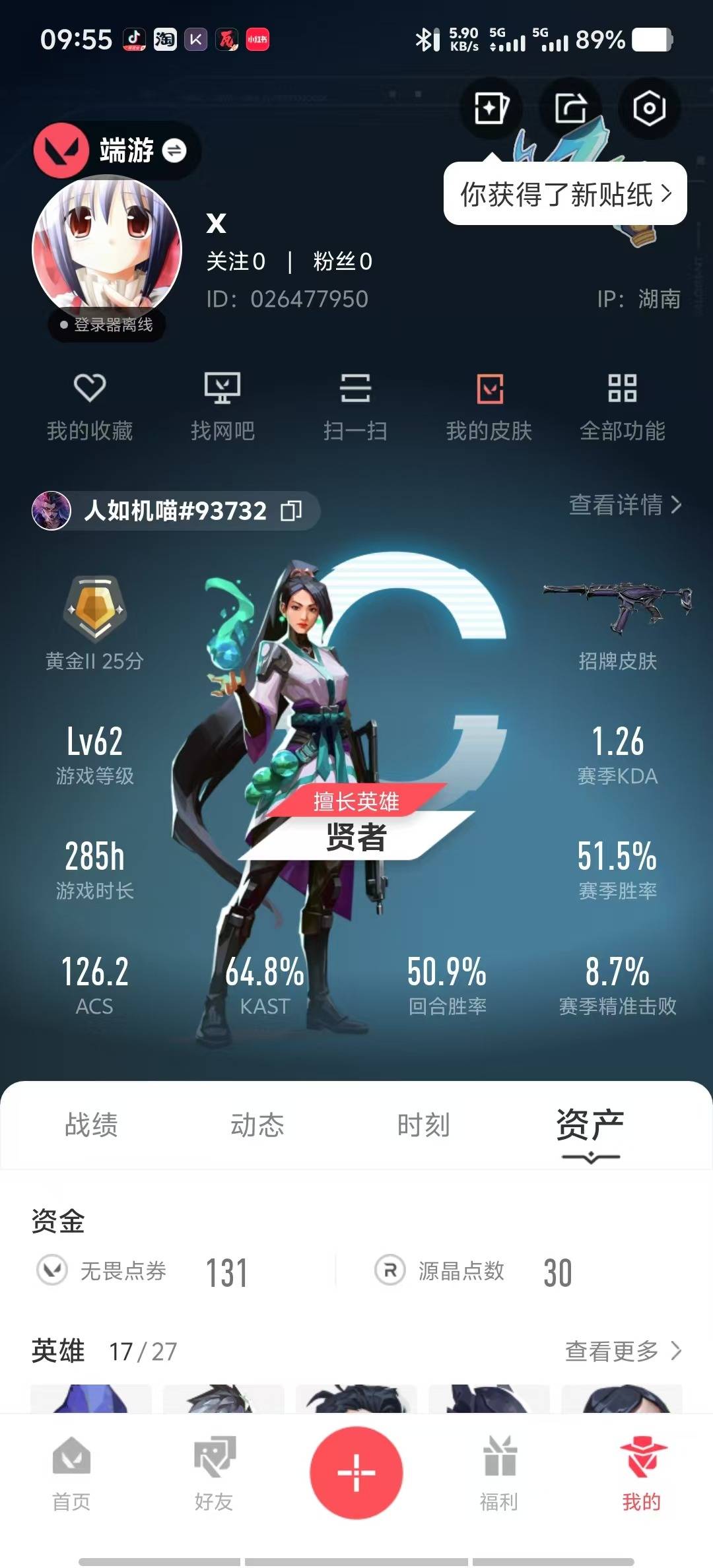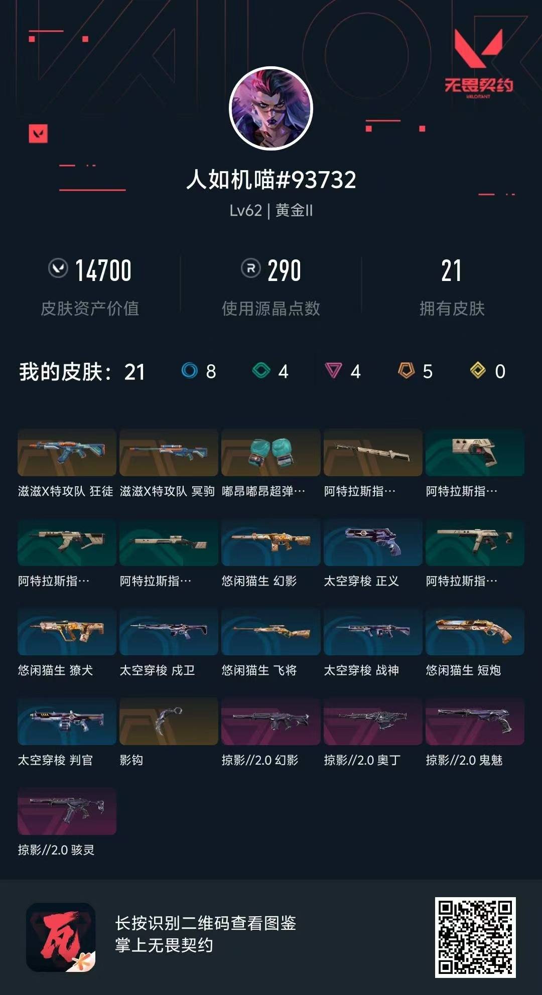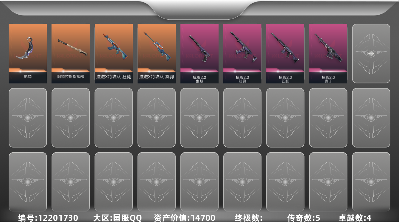 [12201730]5橙皮 4紫皮 21皮肤 17英雄 37卡面 290已用源晶 黄金 优质装备:阿特拉斯指挥部,影钩 套装:滋滋X特工队,掠影2.0套装 佩枪皮肤:鬼魅-掠影2.0 冲锋枪皮肤:骇灵-掠影2.0 步枪皮肤:狂徒-滋滋X特攻队,幻影-掠影2.0 狙击枪皮肤:冥驹-滋滋X特攻队 机枪皮肤:奥丁-掠影2.0