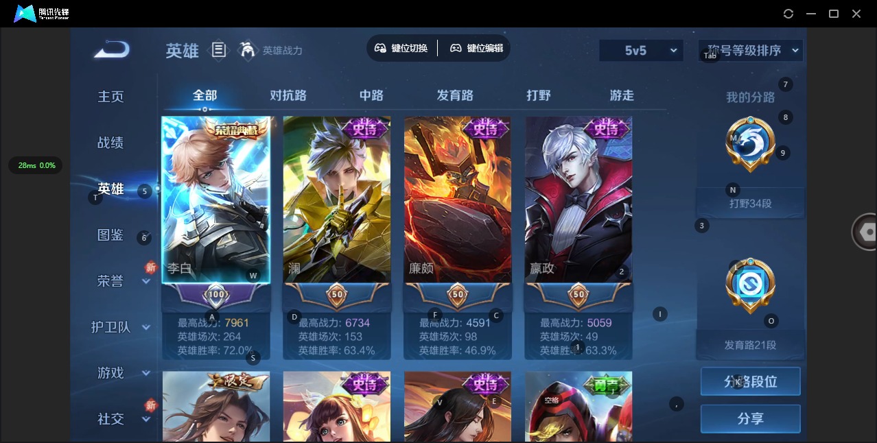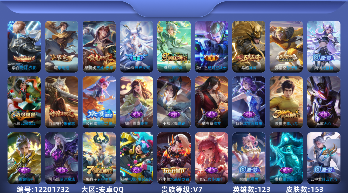 [12201732]V7 1典藏 5传说 123英雄 153皮肤 可修改实名 优质装备:鸣剑·曳影,李逍遥,超时空战士-狄仁杰 珍宝阁皮:女武神,玩趣恶龙 限定皮:鸣野蒿,异界灵契(白毛香),神威(电光马子),高山流水,五谷丰年,梁祝,天狼溯光者,李小龙,朱雀志(守约年限),孙行者,蜜橘之夏,寅虎·赤拳(老虎年限) 史诗皮:化蝶舞,特工魅影,江河有灵,魅语,蒙恬荣光圣徽,冰冠公主,偶像歌手,晚萤,电玩·爆裂旋风,乱世虎臣,修罗,女仆咖啡,摇滚巨星,水果甜心,功夫厨神,暗隐猎兽者,幽灵船长,鬼剑武藏,暗渊魔法,心灵战警,天秀·启明,地狱岩魂,纤云弄巧,拒霜思,缤纷独角兽,水晶猎龙者,金属风暴,原初追逐者,圣诞恋歌,鹰眼统帅,暗夜贵公子,黎明之约,赏金猎手,无心,未来纪元-赵云